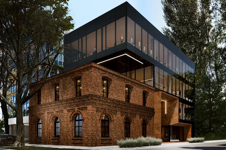 Mały, połączony z nowoczesnymi przeszkleniami butikowy biurowiec utrzymany jest w klimacie łódzkich, pofabrycznych budynków.