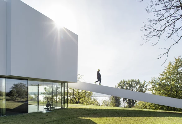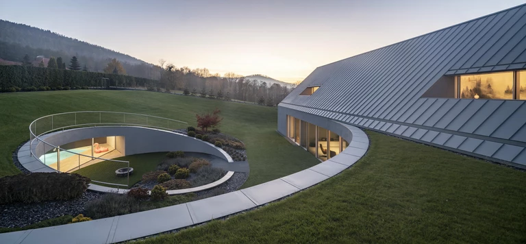 Duża działka wymagała doprowadzenia drogi do budynku – i właśnie ta droga stała się głównym motywem projektu. Dosłownie owinięto nią układ funkcjonalny, dzięki czemu uformowała jednocześnie stropy, dach i ściany.