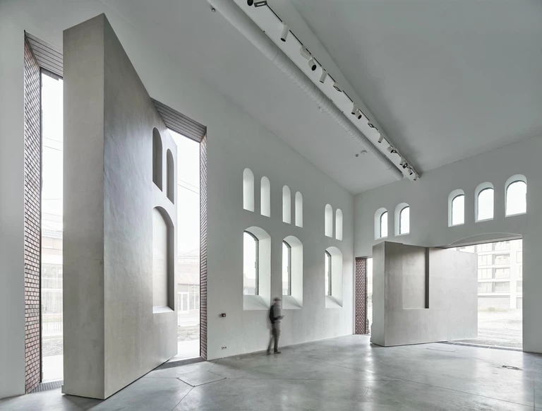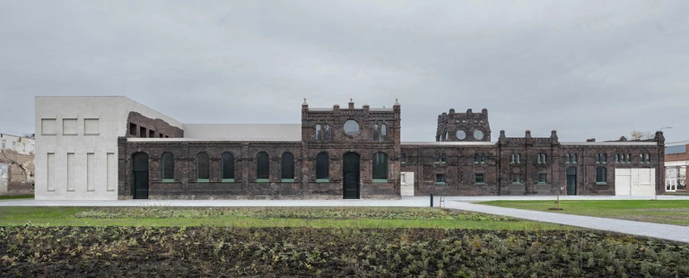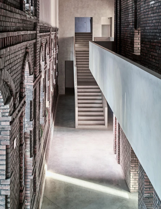 Zachowano przemysłowy charakter obiektu: zabrudzoną cegłę, nieregularne otwory i ślady zniszczeń potraktowano jako integralną część historii miejsca. Ubytki w murach wypełniono współczesnym betonem, tym samym wyróżniając nową interwencję na tle historycznej struktury.