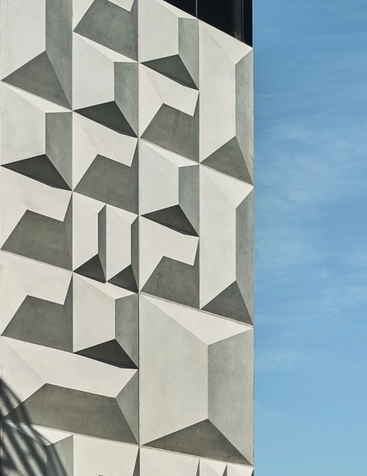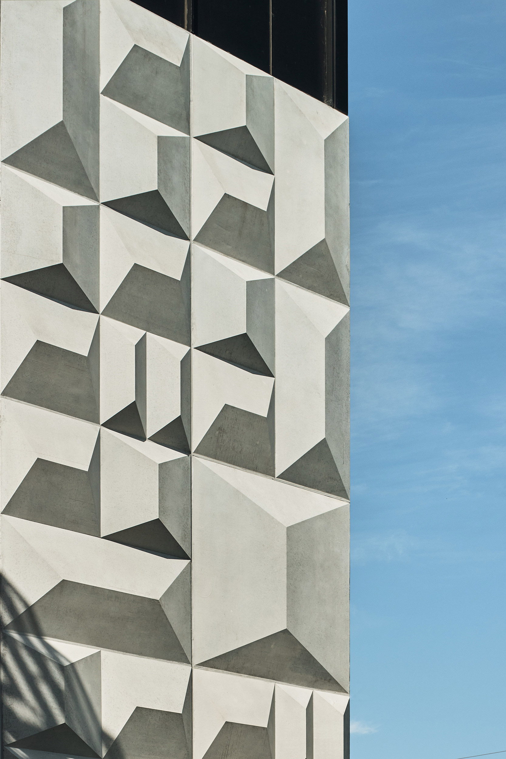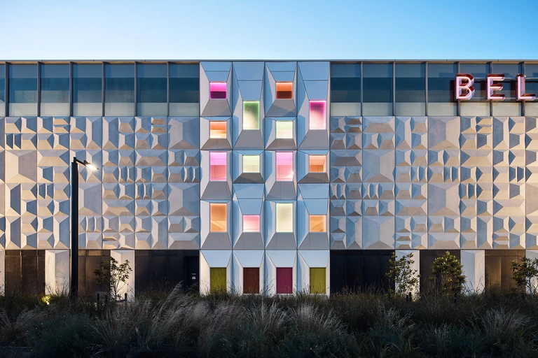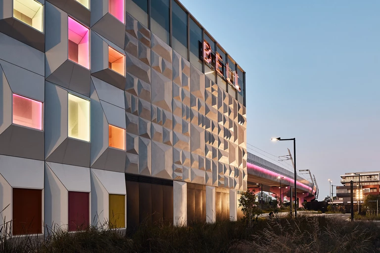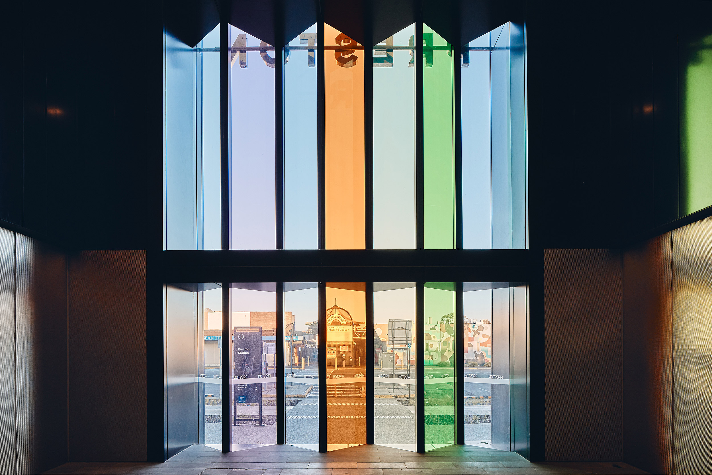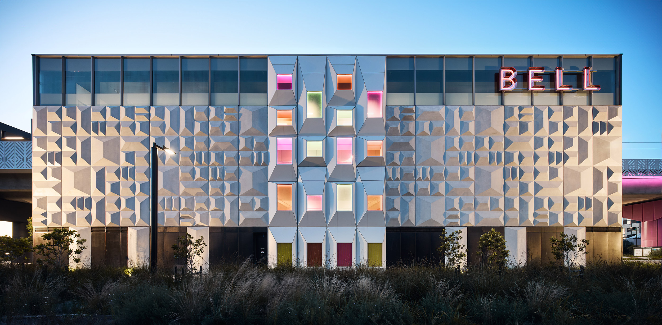 Bell Station czerpie inspirację z otaczającej ją zabytkowej zabudowy mieszkalnej. Charakterystyczne dachy domów w dzielnicy Darebin stały się punktem wyjścia do stworzenia trójwymiarowego, geometrycznego wzoru na betonowej fasadzie. Ukośne formy ożywiają bryłę, a wielobarwne przeszklenia przepuszczają światło do dwukondygnacyjnego holu.