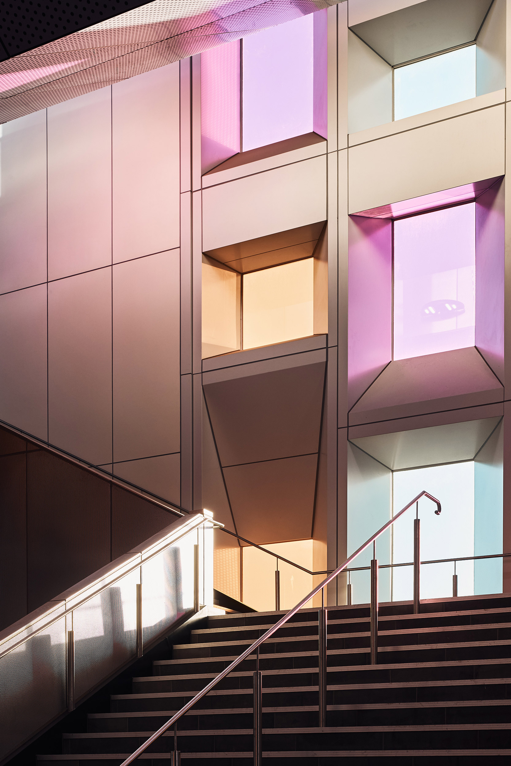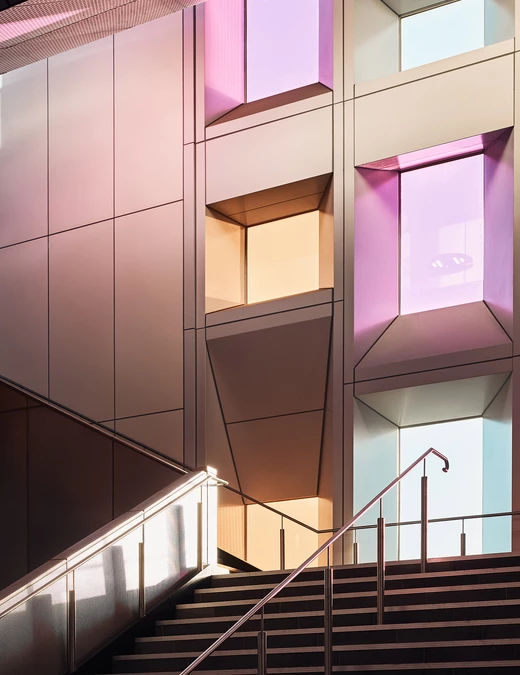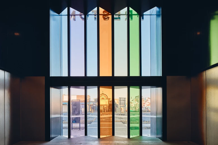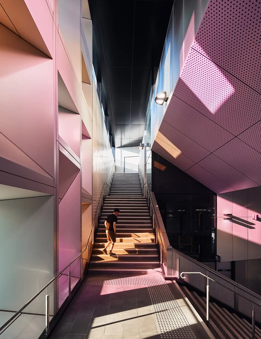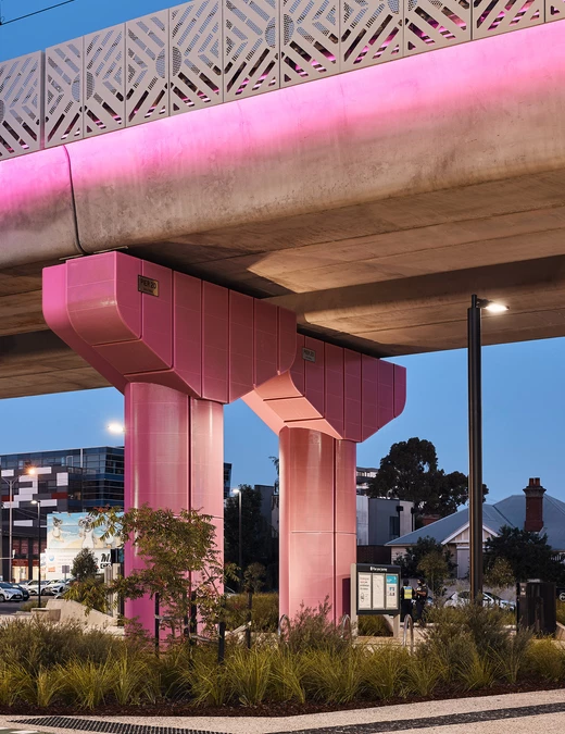 W całym założeniu kolor i geometria stanowią narzędzie tworzenia tożsamości przestrzeni publicznej. Linię Mernda wyróżnia liliowy kolor, który zastosowano na filarach i w oświetleniu stacji. Te niestandardowe barwy, rzadko spotykane w miejskim krajobrazie, czynią z obiektów wyraźne punkty orientacyjne i symbole nowej, przyjaznej kolei. Architektura staje się plastycznym znakiem miejsca.