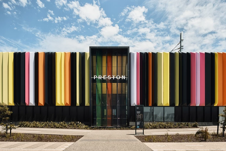 Preston Station, położona nieopodal słynnego Preston Market, odzwierciedla jego energię i koloryt. Elewacja z pionowych fałd przypomina kod kreskowy – odniesienie do handlowej tożsamości miejsca.