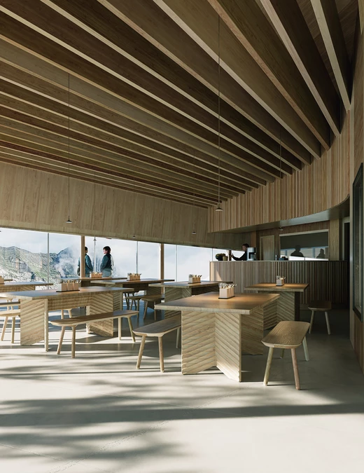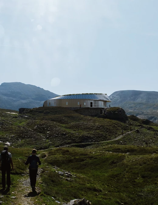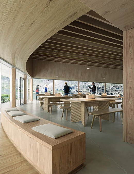 Charakterystyczną cechą schroniska jest jego duży, zazieleniony dach, który płynnie łączy się z krajobrazem, oraz powłoka z recyklingowanego aluminium, chroniąca zewnętrzne przestrzenie przed silnymi wiatrami.
