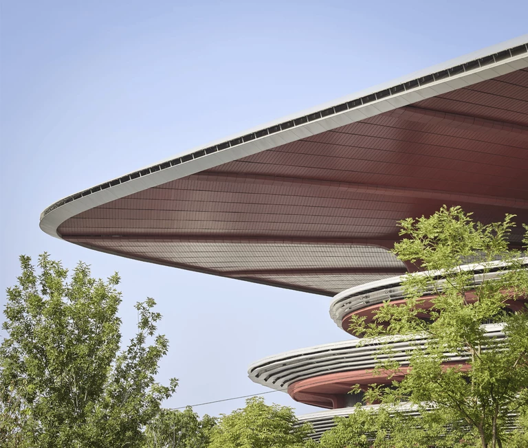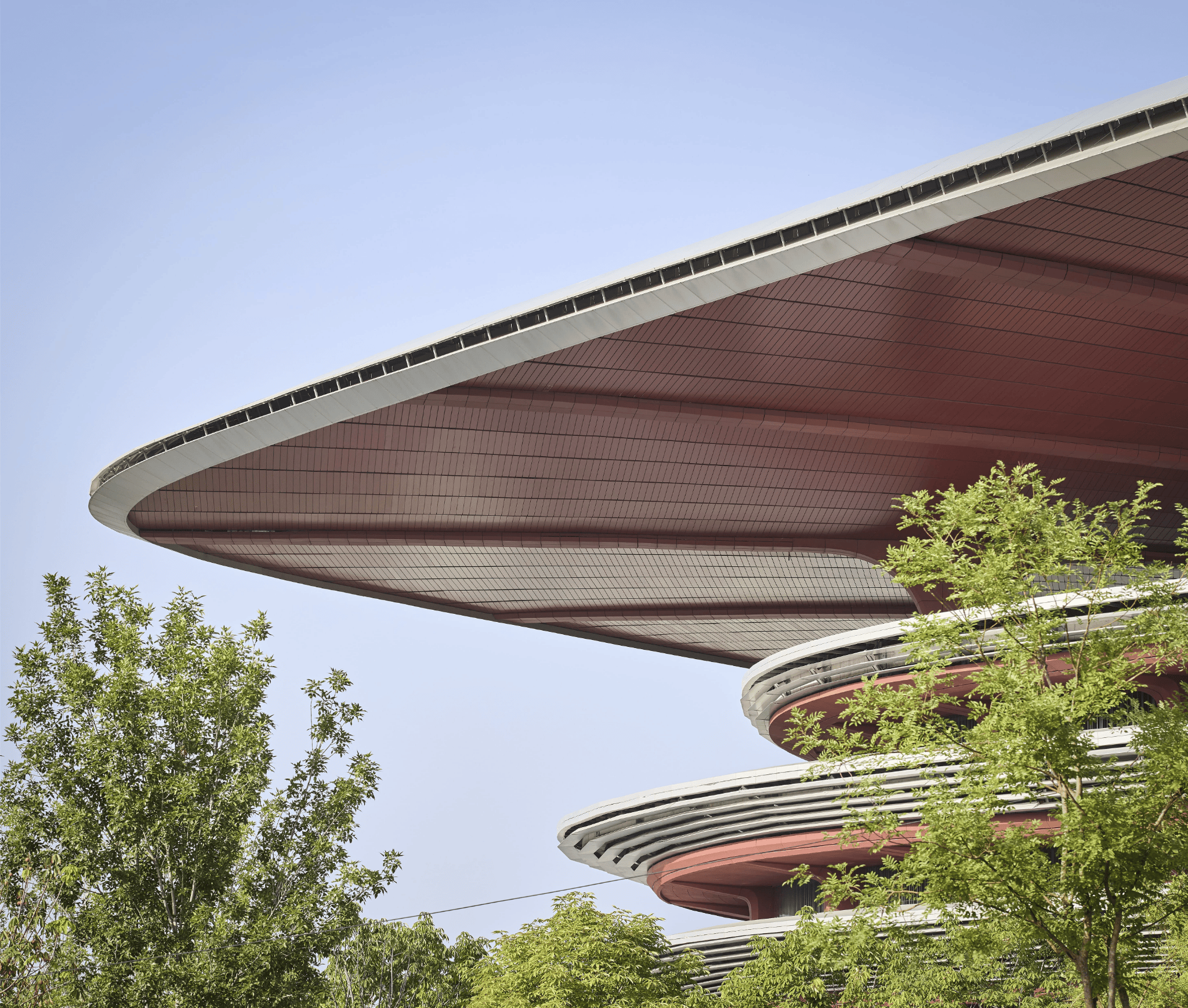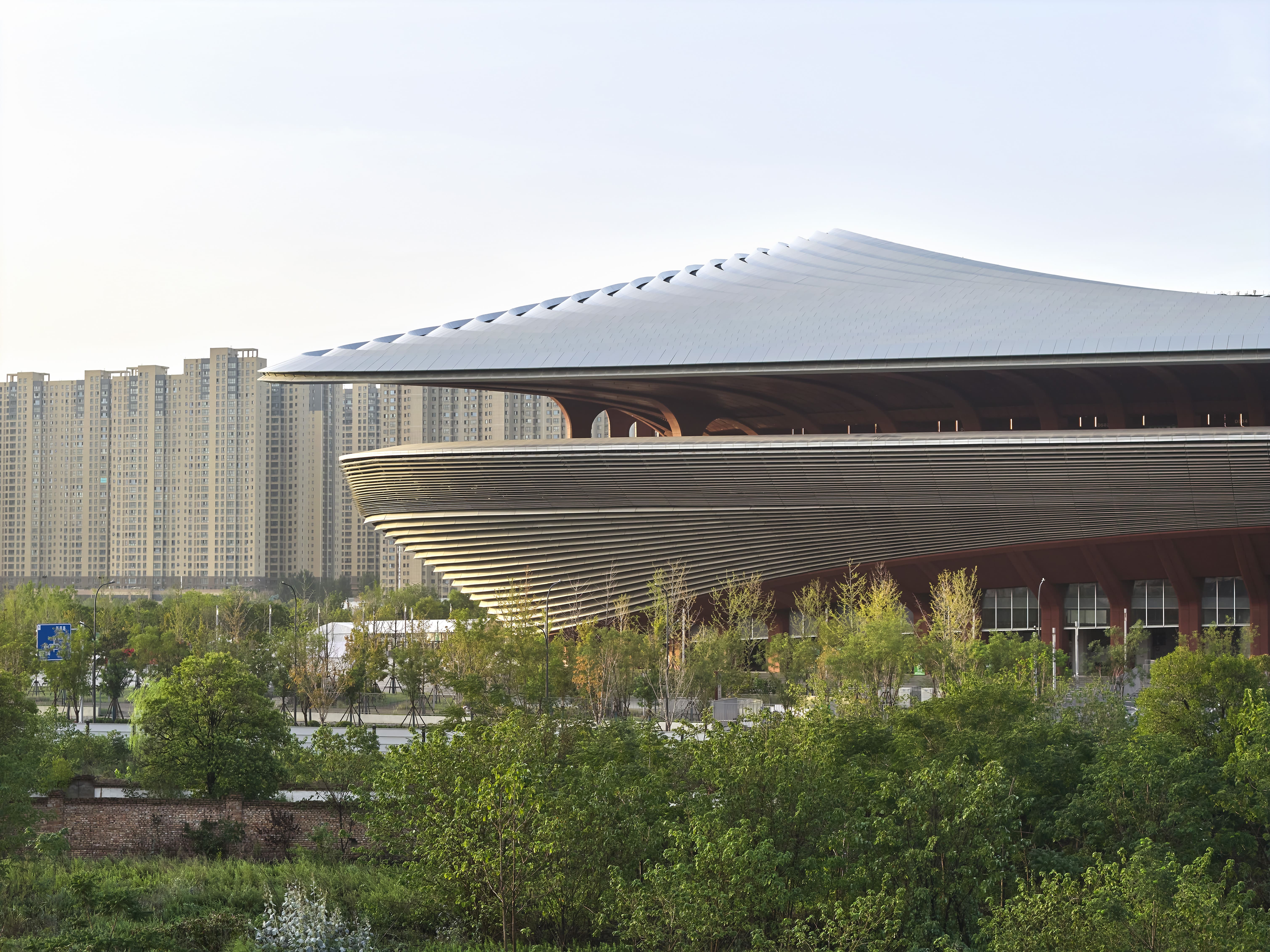 Projektanci Zaha Hadid Architects zastosowali płynną, dynamiczną geometrię form, inspirowaną ruchem i energią gry w piłkę. Dach o ultralekkiej konstrukcji linowo-membranowej ograniczył zużycie materiałów i znacząco redukuje ślad węglowy budowli. Jego kształt minimalizuje także wpływ chłodnych północnych wiatrów, a szerokie okapy i otwarte tarasy zapewniają komfort w gorące, letnie dni typowe dla klimatu Xi’an.