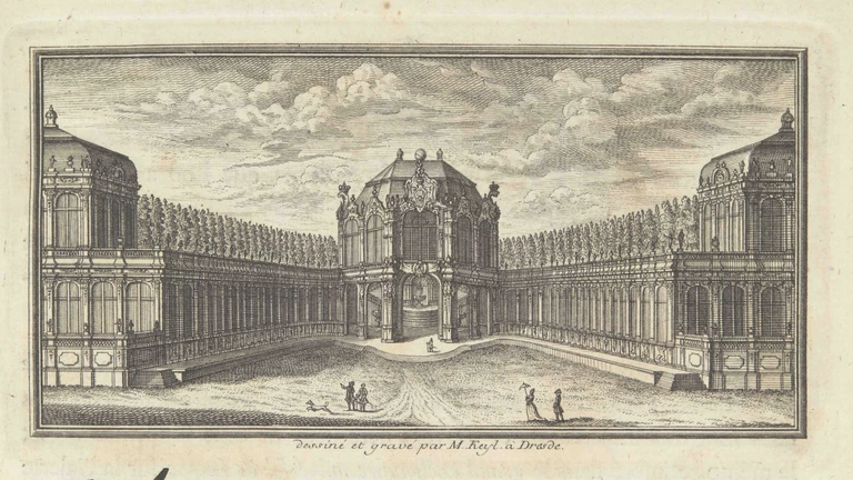 Ch. H. Eilenburg, Kurzer Entwurf der königlichen Naturalienkammer zu Dresden, Drezno, Lipsk 1755. Widok Zwingeru – reprezentacyjnego pałacu w Dreźnie. Miedzioryt.