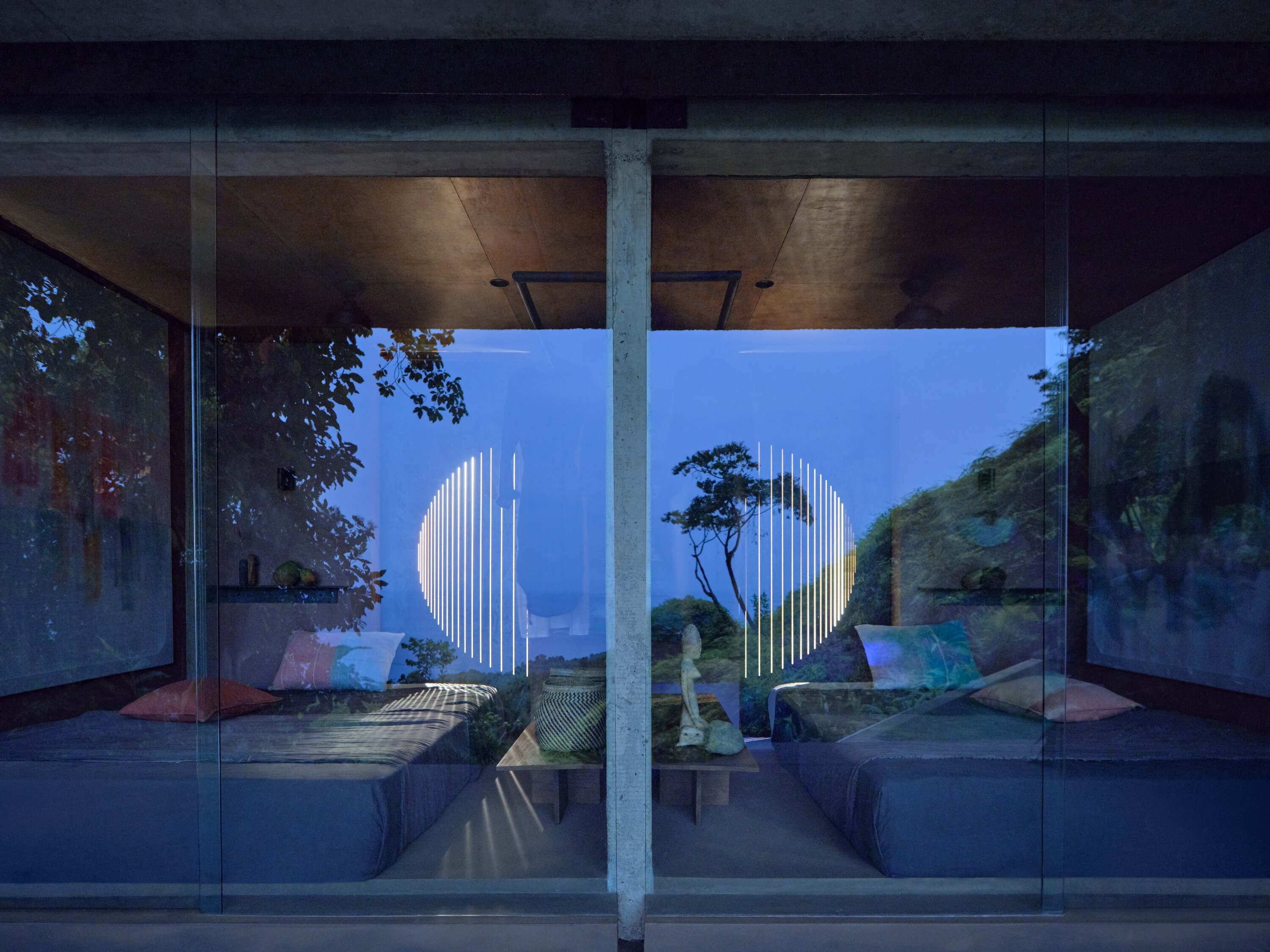 Dolny poziom natomiast pozostaje dyskretnie ukryty od strony prywatnego ogrodu. Na parterze znajdują się dwie niewielkie sypialnie z widokiem na ocean, łazienka z dostępem do basenu oraz przestrzeń gospodarcza. Wnętrza łączy wąski korytarz, wypełniony złoto-czerwonym światłem zachodzącego słońca.
