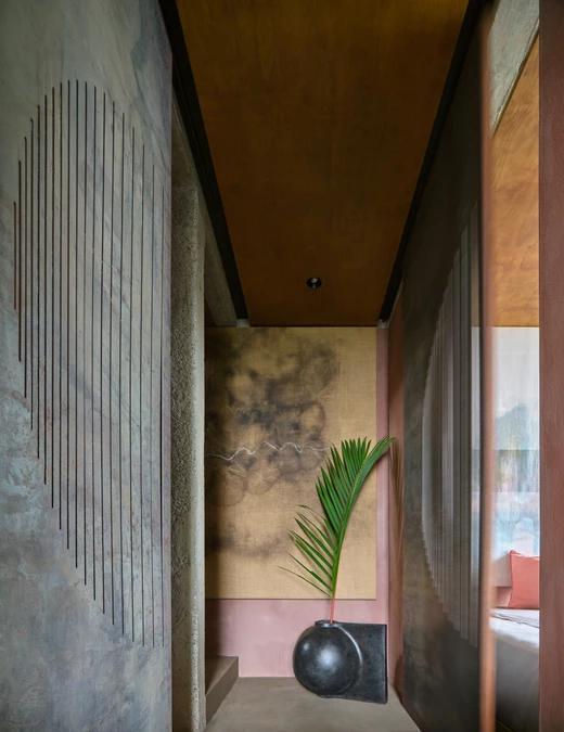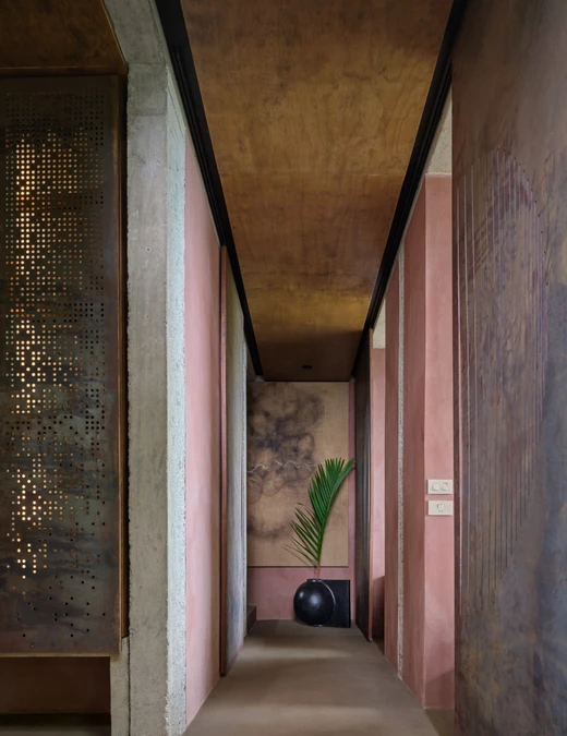 Od strony drogi budynek prezentuje się jako minimalistyczna bryła z ubitej ziemi poprzecinana dużymi przeszkleniami. Podniesiona platforma prowadzi do wejścia, a z drugiej strony – do tarasu z wbudowanym grillem. Dalej schody ze stali Corten schodzą do basenu.