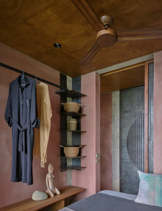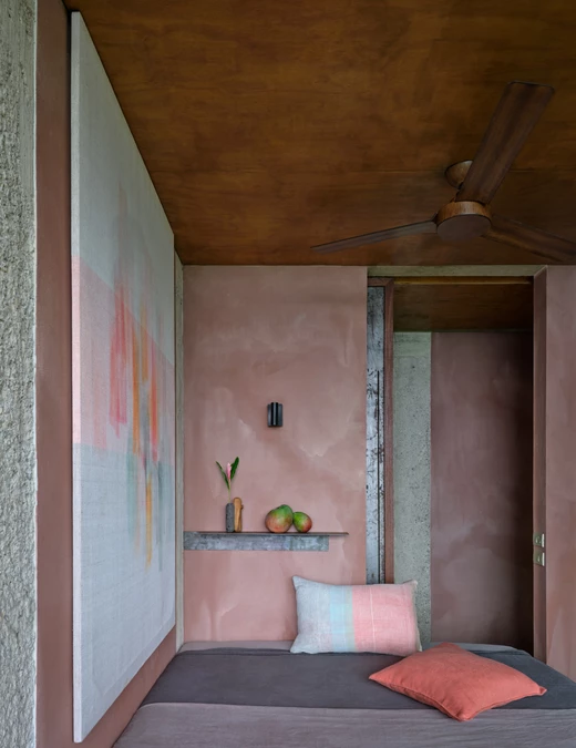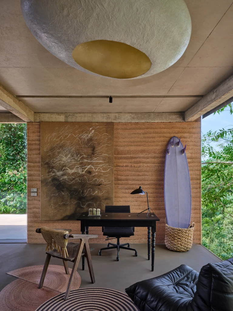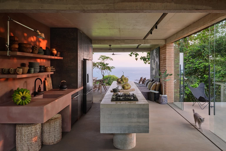 Architektka zdecydowała się na zrezygnowanie z jednej ze ścian zewnętrznych w strefie dziennej. To rozwiązanie sprawiło, że wnętrze stapia się z dżunglą nie tylko wizualnie – powietrze i dźwięki wraz z światłem wnikają do budynku, a granica między tymi dwoma przestrzeniami zanika.