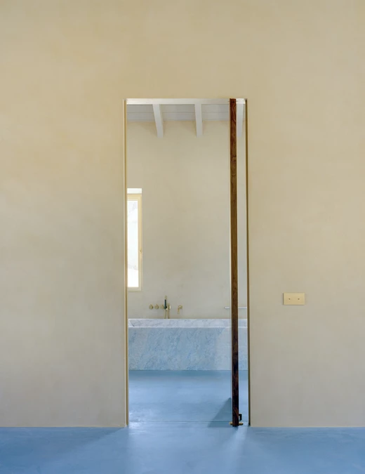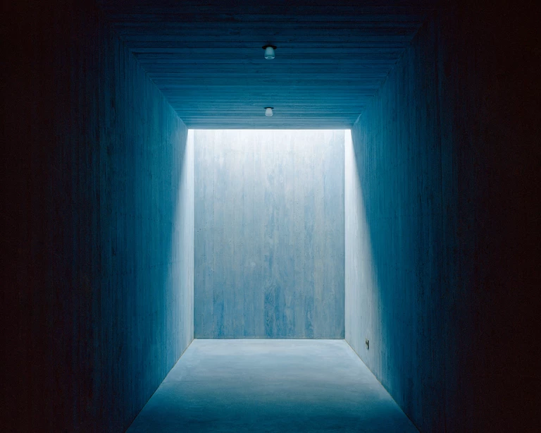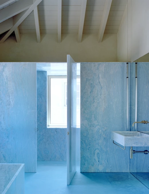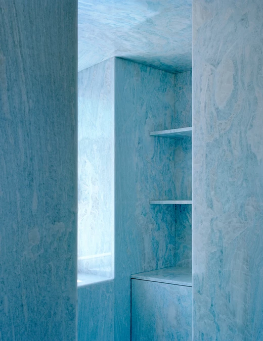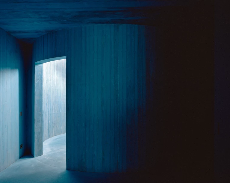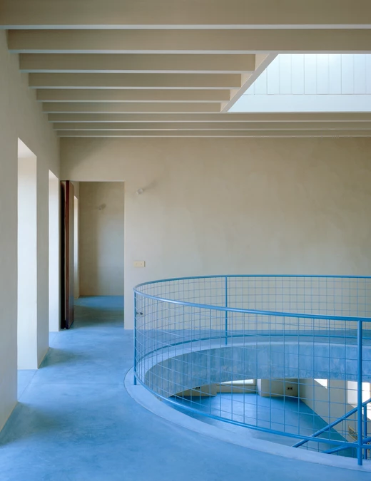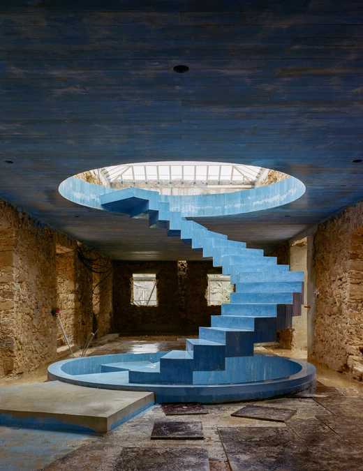 Po całkowitym opróżnieniu wnętrza i pozostawieniu jedynie murów obwodowych, w przestrzeni osadzono nową strukturę z betonu barwionego na niebiesko. Struktura wyrasta z piwnicy, gdzie wciąż mieści się winiarnia, i wspina się spiralnie w górę, spinając kolejne kondygnacje domu. Całość wieńczy świetlik, który wprowadza do wnętrza miękkie, rozproszone światło.