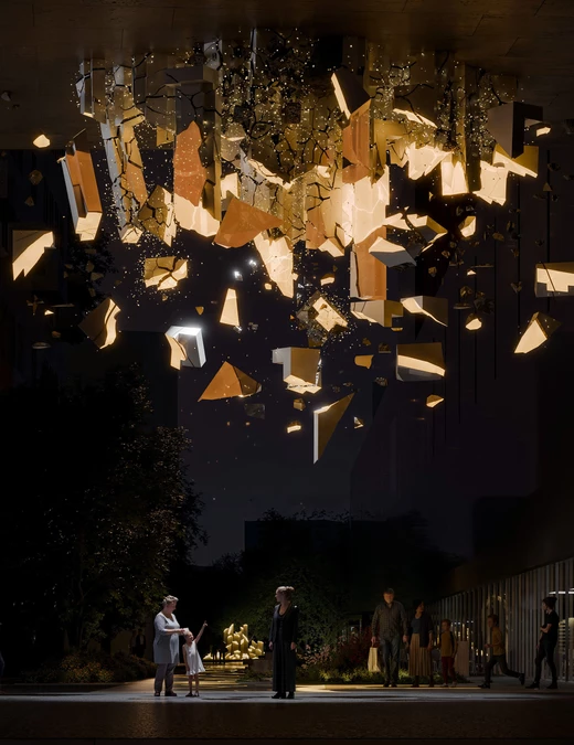 The Impact rozpocznie się przy Fields Mall – tam dwa dzieła sztuki wyrosną z ziemi niczym meteoryty. Stamtąd złota, świetlista szczelina poprowadzi w stronę Royal Arena, wprowadzając refleksy, światło i elementy rzeźbiarskie, które stworzą spójny pasaż.