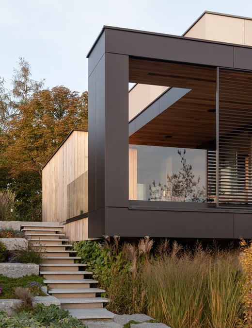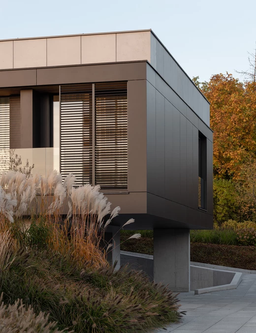 Konstrukcję bryły podkreślają materiały zastosowane na elewacji, takie jak beton, czarne płyty włókno-cementowe oraz drewno. Elewację tworzą też duże przeszklenia i przesuwne zewnętrze rolety przeciwsłoneczne.