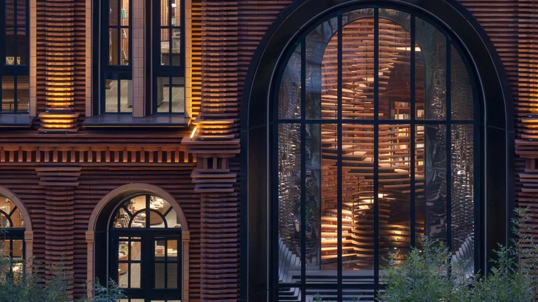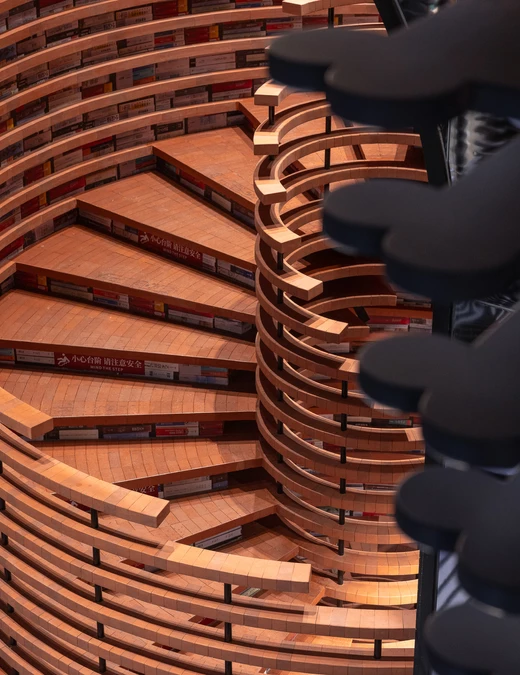 Cała główna bryła Tianjin Zhongshuge została wykonana wyłącznie z cegieł, uzupełnionych jedynie stalowymi elementami. Pozwoliło to na zbudowanie wizualnego napięcia między ciepłym odcieniem cegieł a chłodnym, industrialnym charakterem stali.