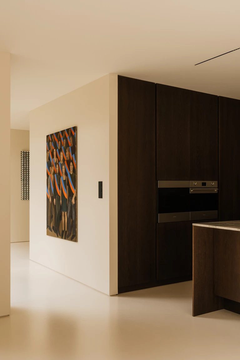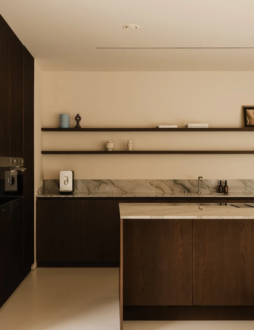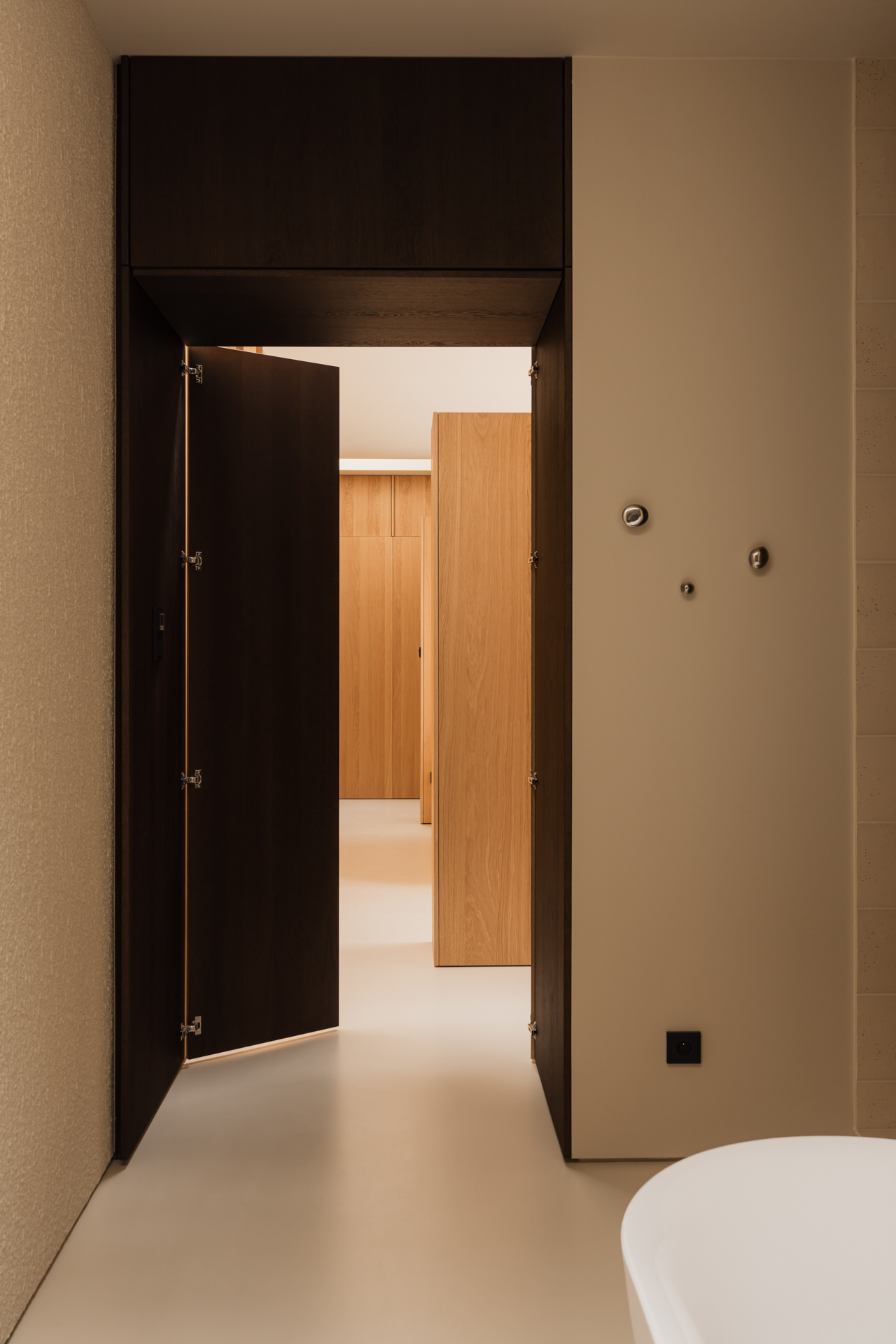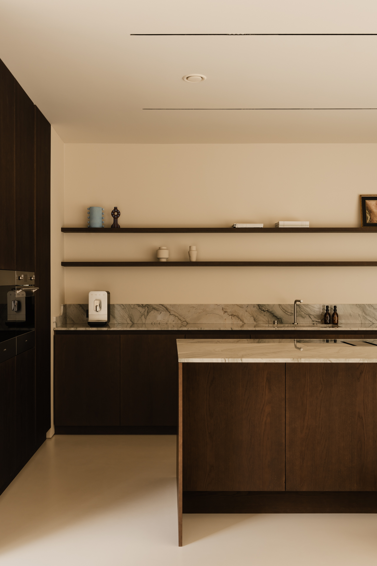 Meble wykonane z forniru dębowego w ciemnym odcieniu oraz detale z ceramiki i kamienia podkreślają organiczny charakter przestrzeni.