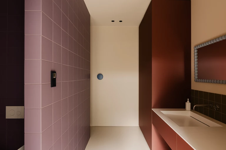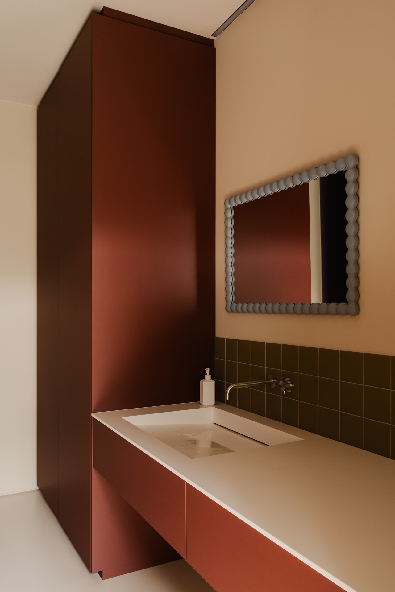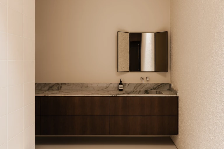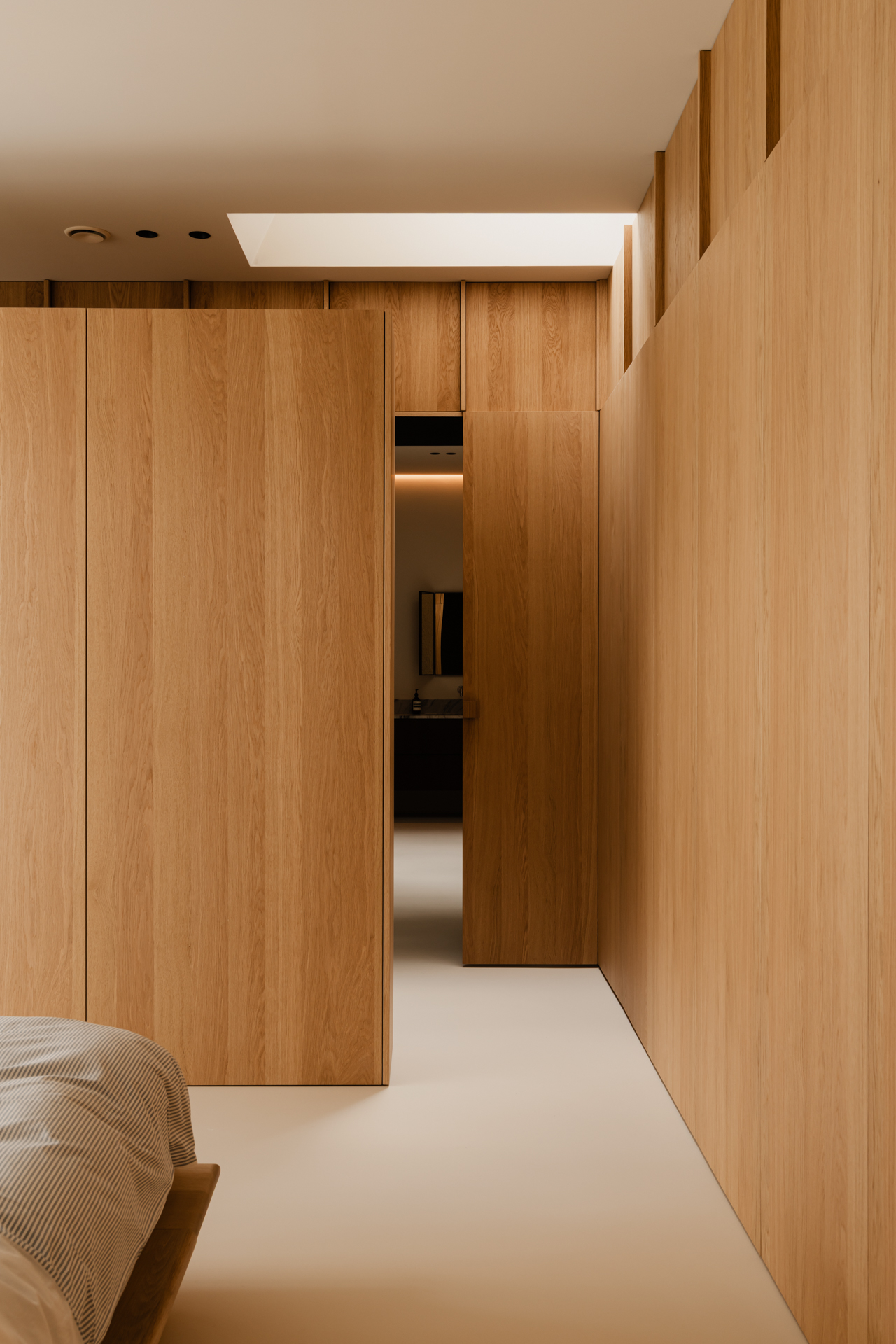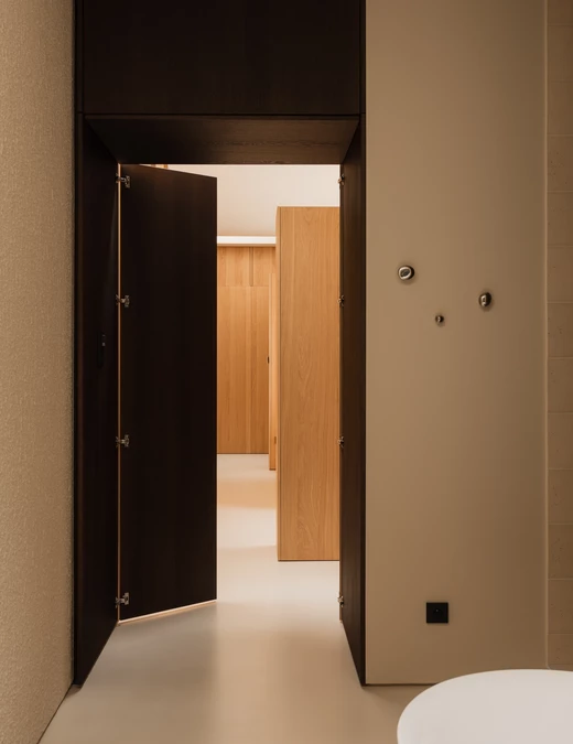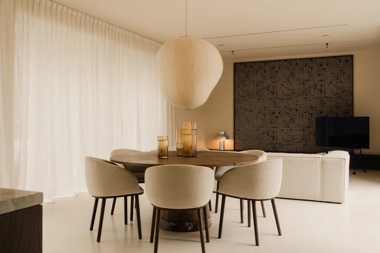 Meble wykonane z forniru dębowego w ciemnym odcieniu oraz detale z ceramiki i kamienia podkreślają organiczny charakter przestrzeni.