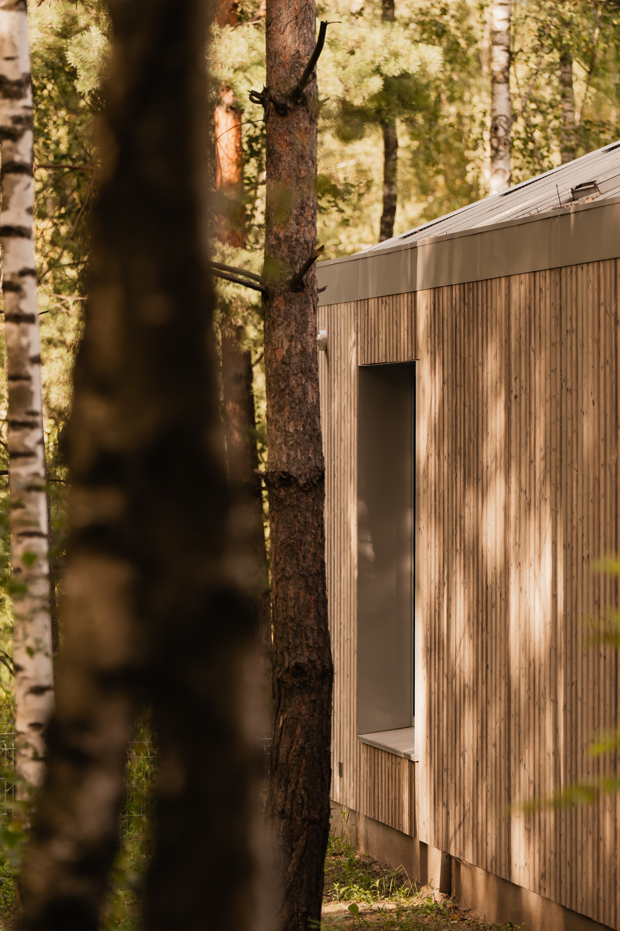 Budynek wzniesiono w drewnianej konstrukcji, z dużym naciskiem na zrównoważone rozwiązania. Elewacje obłożono naturalną deską, która z upływem czasu pokryje się szlachetną patyną, tym samym wtapiając się w kolorystykę kory drzew i otaczającego lasu.