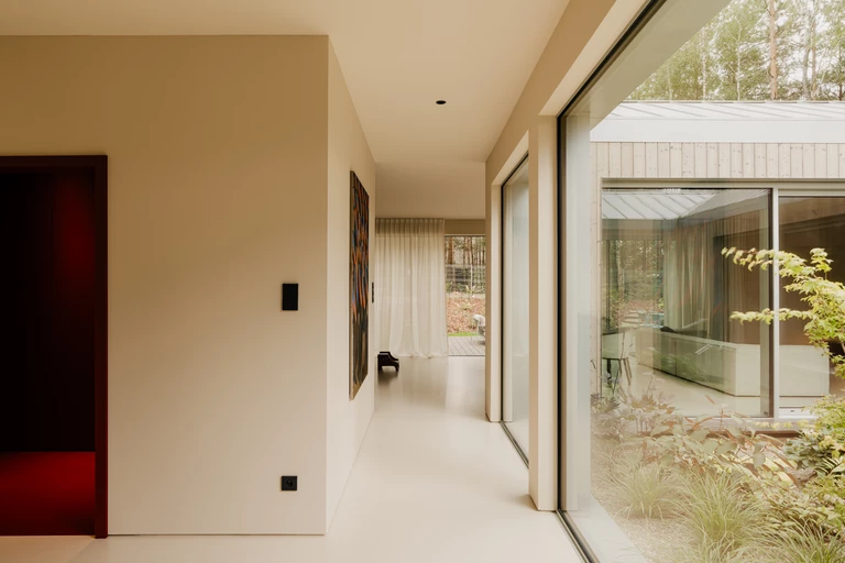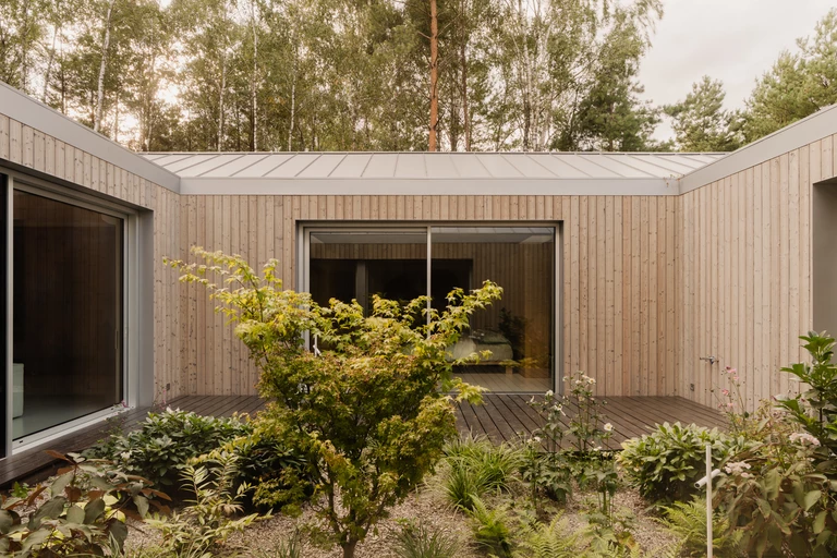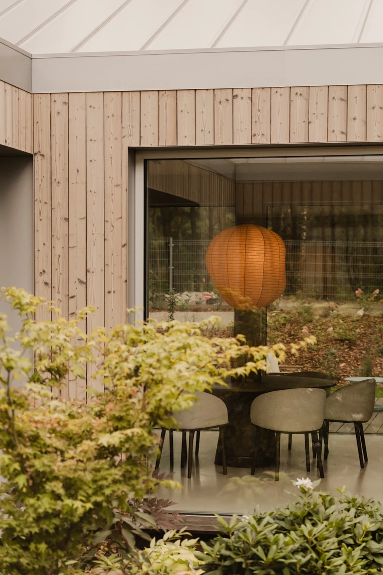 Sercem domu jest centralne atrium – półotwarta przestrzeń z niewielkim ogrodem wewnętrznym. To kameralne miejsce sprzyja wyciszeniu, tworząc strefę odpoczynku i kontaktu z naturą, niezależnie od pory roku.