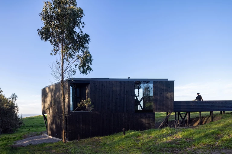 Prosta bryła z czarnego drewna idealnie wpisała się w nierówną działkę. Architekci zadbali o to, by sąsiadujący z budynkiem ocean stał się częścią wnętrz – kadr na pobliskie wybrzeże zagościł w domu dzięki niemal całkowicie przeszklonej górnej kondygnacji.