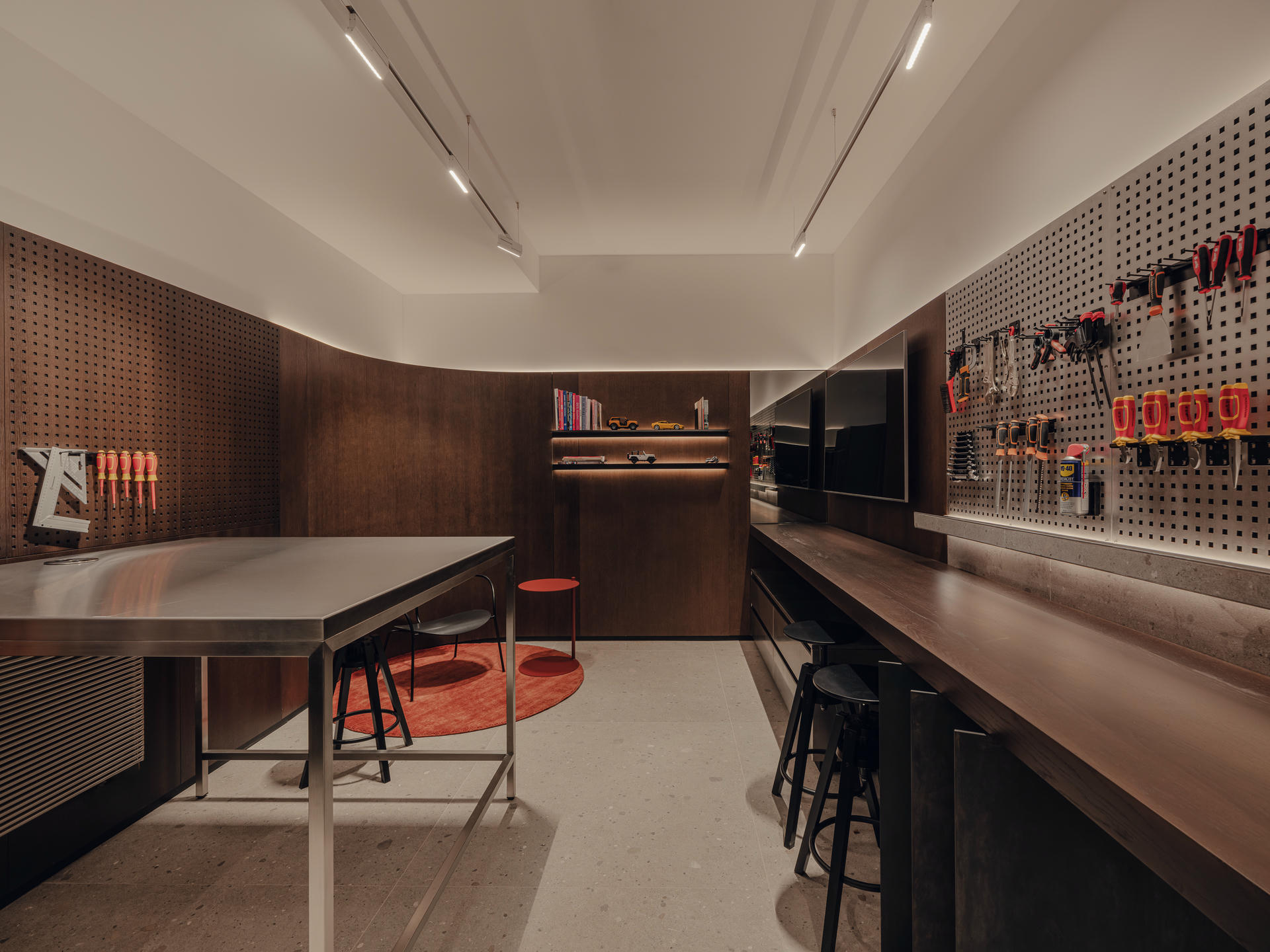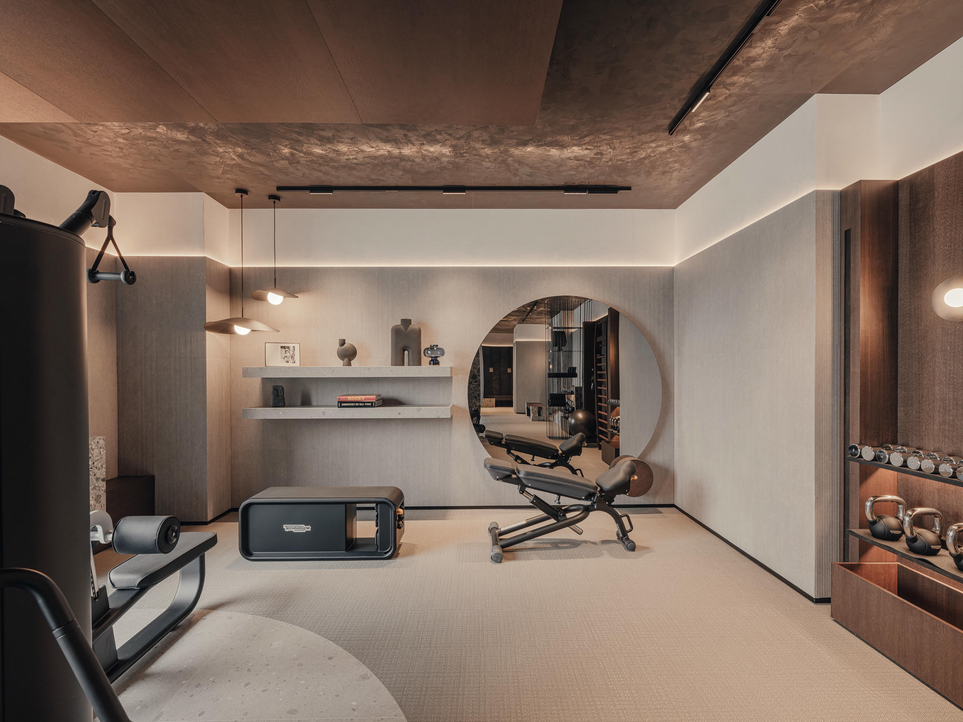 Strefa fitness oferuje sprzęt Technogym, natomiast w części dla dzieci postawiono na drewniane zabawki i pluszaki obciążeniowe wspierające regulację emocji i rozwój sensoryczny.