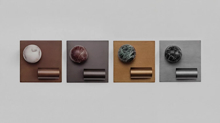W Babylon materiały same opowiadają historię. Ramiona z mosiądzu współgrają z kamieniem w czterech dopracowanych konfiguracjach: Vintage Brass z Verde Alpi, Mahogany z Calacatta Viola, Classic Bronze z Rosso Levanto oraz Tarnished Silver z Calacatta Black. Każde zestawienie tworzy harmonijną całość, a w indywidualnych aranżacjach kompozycje mogą ewoluować, dostosowując się do przestrzeni i wizji projektowej.