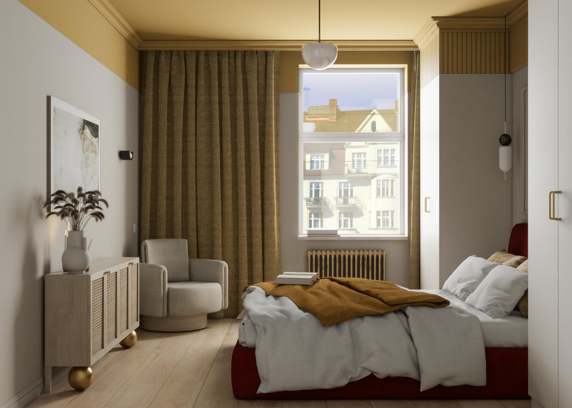 Fotel Bofii wpisał się w projekt na wielu płaszczyznach – podkreśla autorka projektu. – Polski mebel o lekkiej formie, starannym wykończeniu jak i kompaktowych wymiarach (to ten mniejszy model) doskonale podkreślił charakter sypialni w kamienicy. Wraz z klientką absolutnie pokochałyśmy go za to, że jest obrotowy.