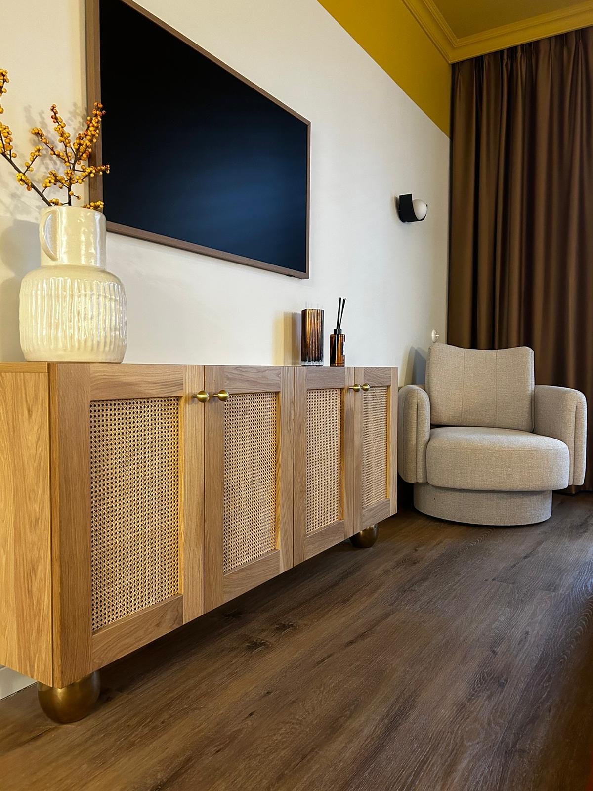 Kluczowe było dla mnie stworzenie przestrzeni wyciszającej, pełnej naturalnych materiałów i subtelnych detali. Jasna, spokojna paleta barw, dopracowane proporcje, meble o organicznych formach oraz nastrojowe oświetlenie tworzą harmonijną całość – mówi projektantka. – Fotel Bofii przyciągnął moją uwagę ze względu na wyjątkową formę, nowoczesną, ale jednocześnie przytulną. Dzięki swojej rzeźbiarskiej sylwetce i miękkim liniom doskonale zbalansował minimalistyczny charakter wnętrza, dodając mu ciepła i nieformalnej elegancji. Stał się także mocnym, ale spójnym akcentem, który podkreślił estetykę całej przestrzeni.