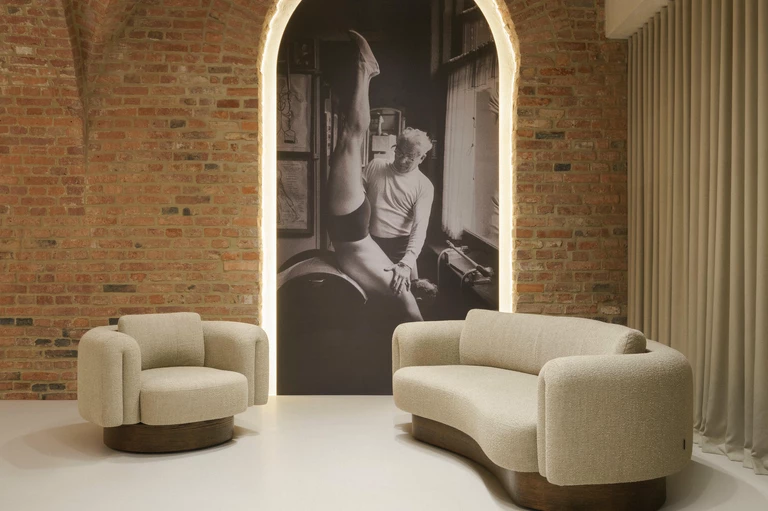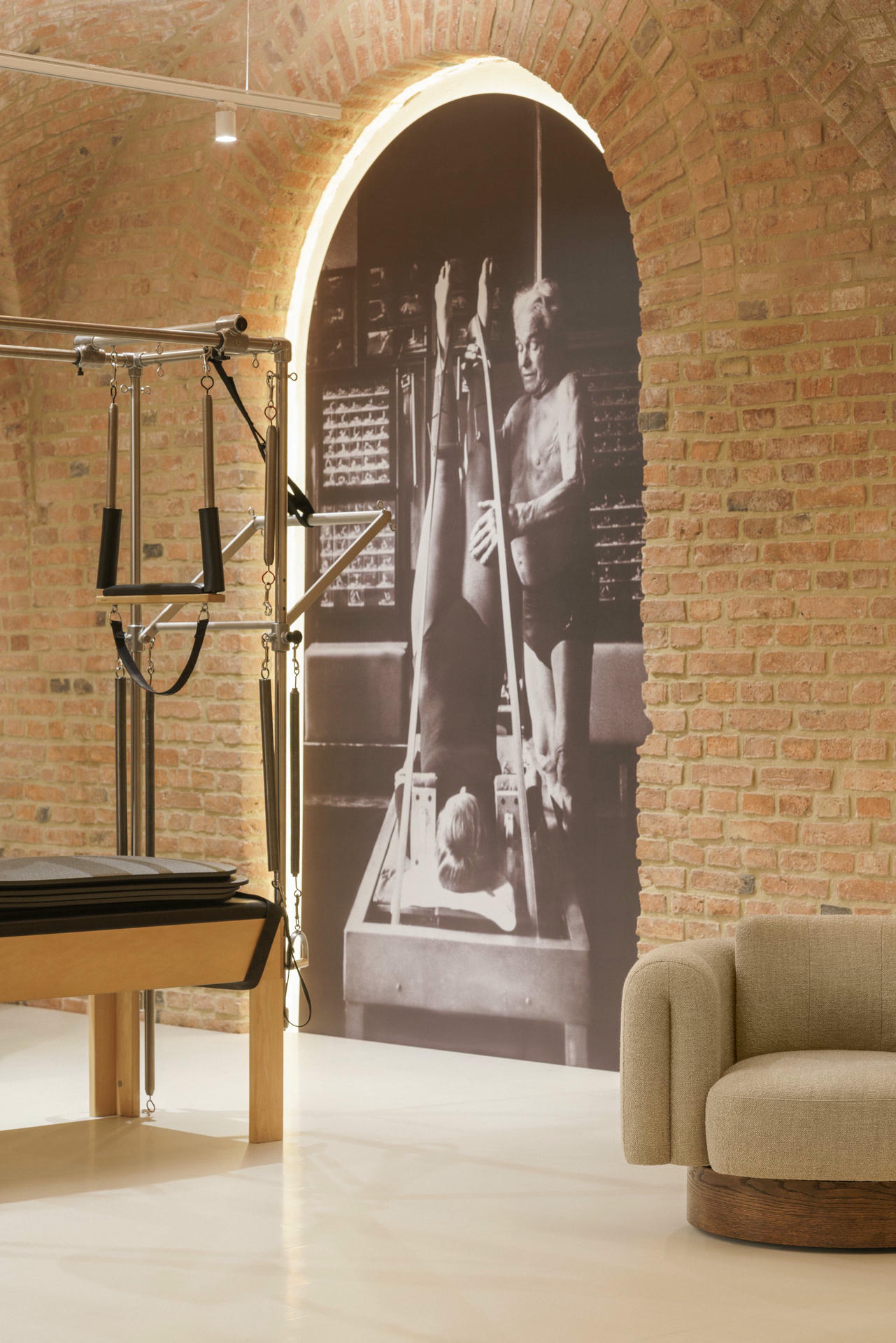 Wnętrze uzupełniają nowoczesne, oszczędne w formie meble i sprzęty do pilatesu, starannie wpisane we wnętrze. Jednocześnie, dzięki przytulnej i pięknej w formie sofie Bofii oraz ciepłemu oświetleniu, całość tworzy wyjątkową atmosferę sprzyjającą koncentracji i relaksowi. Subtelne, eleganckie meble wypoczynkowe Bofii w strefie wejściowej umożliwiają odpoczynek przed lub po zajęciach.
