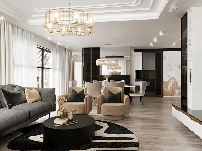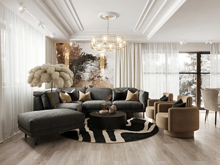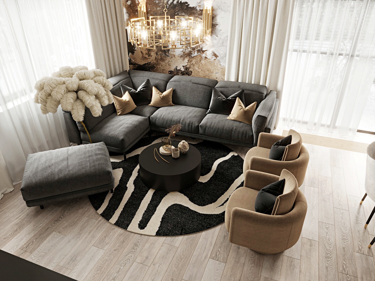 Szykowna grafitowa sofa na nóżkach idealne oddaje styl modern classic. Z kolei geometryczne fotele w swych posągowych kształtach stanowią kwintesencję modernizmu. Jak wyjaśnia autorka projektu, ich minimalistyczny charakter przełamuje wszechobecny luksus. A interesującą formę, która zapewnia przyjemny relaks, można łatwo dopasować do możliwości przestrzeni. Cały zestaw, odważny i wyrafinowany zarazem, stanowi świetny przykład na to, że dobry design jest nie tylko ponadczasowy, ale także znakomicie współtworzy projekty wnętrz w różnych konwencjach.
