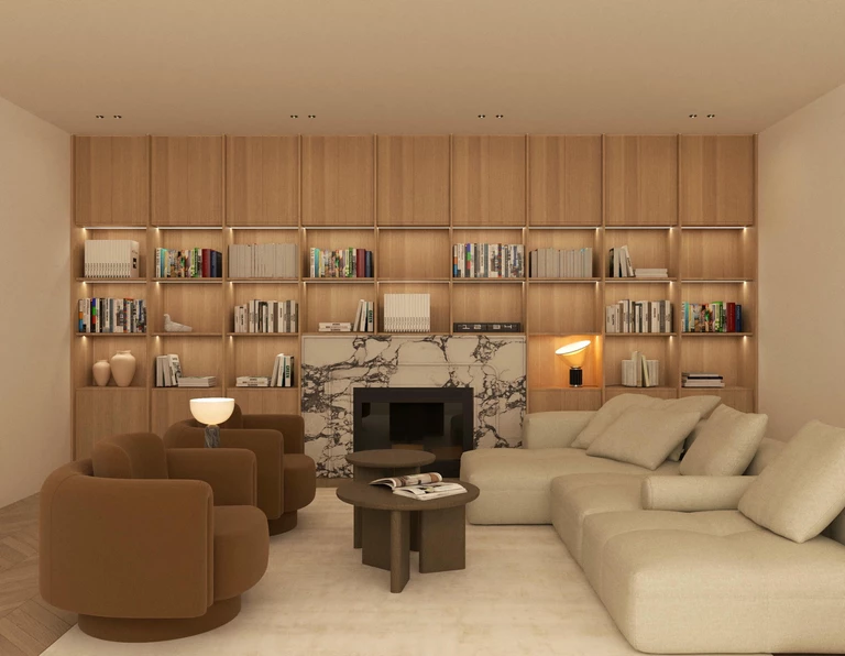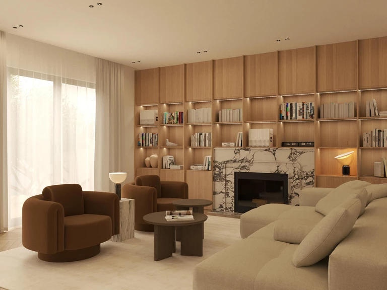 Hanna Stylińska, właścicielka pracowni HAST Design stworzyła projekt salonu w stylu quiet luxury i przytulnego minimalizmu z dwoma fotelami Bofii z tapicerowanymi cokołami, w kolorze czekoladowego brązu.