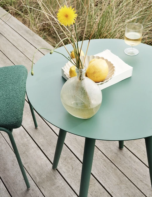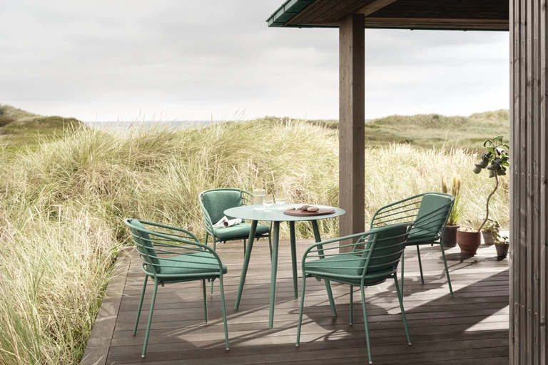 "Podczas gdy do produkcji krzeseł preferowane jest lekkie aluminium, stal jest najlepszym wyborem w przypadku materiału na stół" – mówi Georgsen. "Chcieliśmy, aby był on pokaźnych rozmiarów, ale nadal możliwy do łatwego przenoszenia. Jeśli powierzchnia jest nierówna, jak w przypadku większości balkonów i tarasów, nogi są wyposażone w regulowane "podstawki".