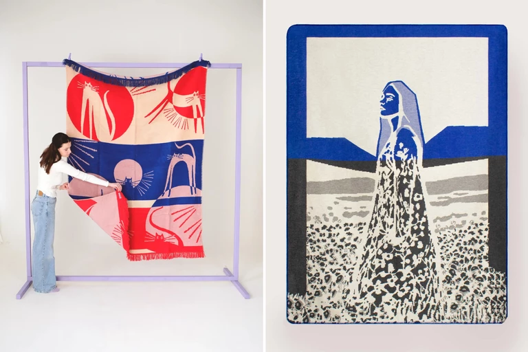 Niesforne kocie harce na tekstylnej ilustracji uchwyciła Julia Luteracka, połowa duetu Panama Studio. Koc wykonano z mieszanki bawełny (aż do 60% tego materiału pochodzi z drugiego obiegu), akrylu i poliestru.
