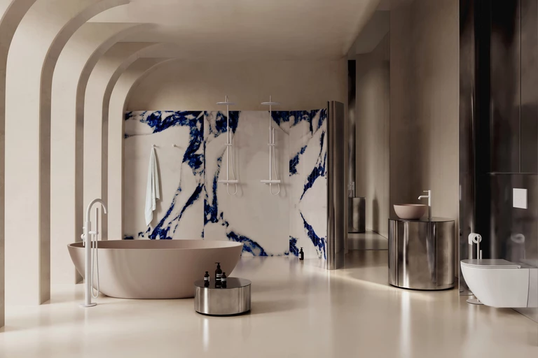 Łazienka o starannie zaplanowanych układach ścian, rytmicznych łukach i „miękkiej” geometrii to perfekcyjna scenografia dla codziennych rytuałów. Producent armatury łazienkowej OMNIRES postawił na podejście neoarchitektury, które traktuje przestrzeń jako samodzielną strukturę – taką, która nie jest tłem dla wyposażenia, a integralnym elementem kompozycji. Kluczowa dla ducha Reflexive Neutrals jest też paleta barw – o ciepłych tonach, oparta na odcieniach szarości, złamanej bieli i piaskowego beżu. Te niemal pudrowe kolory są delikatnym tłem dla mocniejszych akcentów, jak żył niebieskiego kamienia, co nadaje malarskiego sznytu.