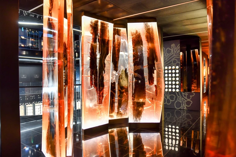 Ale to nie jedyne rozwiązania. Wewnątrz znajdziemy odbijające się w czerni posadzki z indyjskiego granitu morze punktów, świetlnych imitujących niewielkie bryłki bursztynu otaczające stoisko kasowe zaprojektowane przez Oskara Ziętę. Na wystawę prowadzą schody ubrane w diabelską czerwień z linii kosmetyków znanego domu mody (Rouge 666 Matte Kisss), oraz grę głębi lustrzanych odbić, osiągniętą za pomocą wielkoformatowych skrawków polerowanego metalu, w której główną rolę gra ocalały z pożogi XIV wieczny mur z symetrycznie rozłożonymi wąskimi oknami. W bursztynowy świat zabiera nas winda w całoszklanym szybie. To z niej widać ogrom bursztynowego świata.
