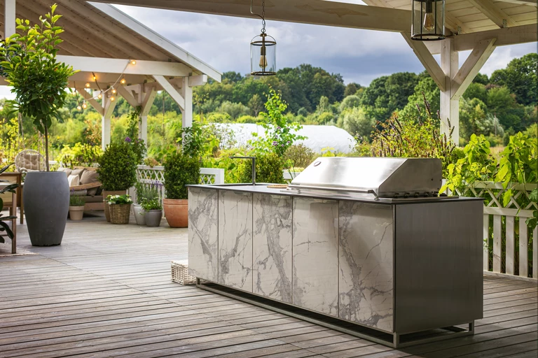 Blaty w kuchniach ogrodowych CANA wykonane są z wyselekcjonowanych włoskich i hiszpańskich spieków kwarcowych, które charakteryzują się zróżnicowanym i oryginalnym wzornictwem. Dzięki temu można je dopasować do ogrodów czy tarasów o różnej stylistyce. Wzory spieków mogą przybierać charakter kamienia naturalnego, metalu czy też niezliczonych odcieni betonu architektonicznego. Co więcej, spieki kwarcowe są odporne na zarysowania i przebarwienia oraz skrajne warunki atmosferyczne. Powstają z naturalnych minerałów i nie są podatne na działanie wilgoci oraz wody. To wszystko sprawia, że spieki nadają się idealnie do użytku w kontakcie z żywnością, nawet w skrajnie wysokich temperaturach.