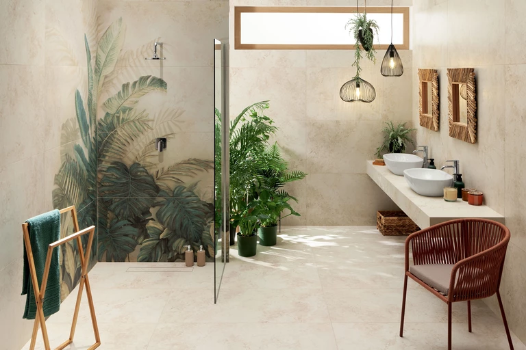 Beżowe płytki są idealnym tłem dla imponującej roślinnej dekoracji ściennej, która jest wyróżnikiem całej kolekcji. To zestawienie ośmiu elementów Alabaster Shine leaves, z których każdy cechuje się niepowtarzalnym wzorem palmowych liści – delikatnie naszkicowanych, o wielu odcieniach zieleni i zmiennej intensywności rysunku. Razem tworzą efektowny obraz w dużym formacie (240 x 240 cm), urzekający malarskością, nieprzytłaczającym artyzmem i subtelną grą półcieni.