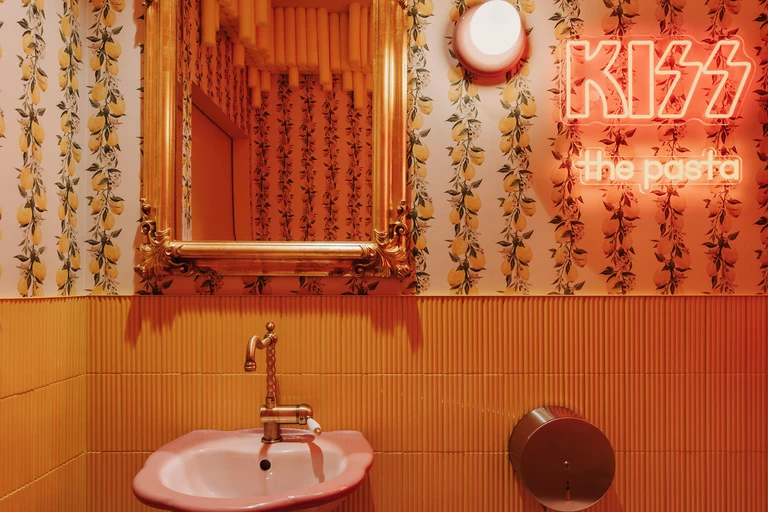 Osobny rozdział stanowi łazienka – zupełnie odmienna od reszty lokalu, odważniejsza, z przymrużeniem oka i sycylijskimi odniesieniami. Na ścianach pojawia się tapeta w cytryny, płytki z reliefem przywodzącym na myśl makaron, a na suficie lustro, pod którym zawisły kolorowe makarony do pływania.