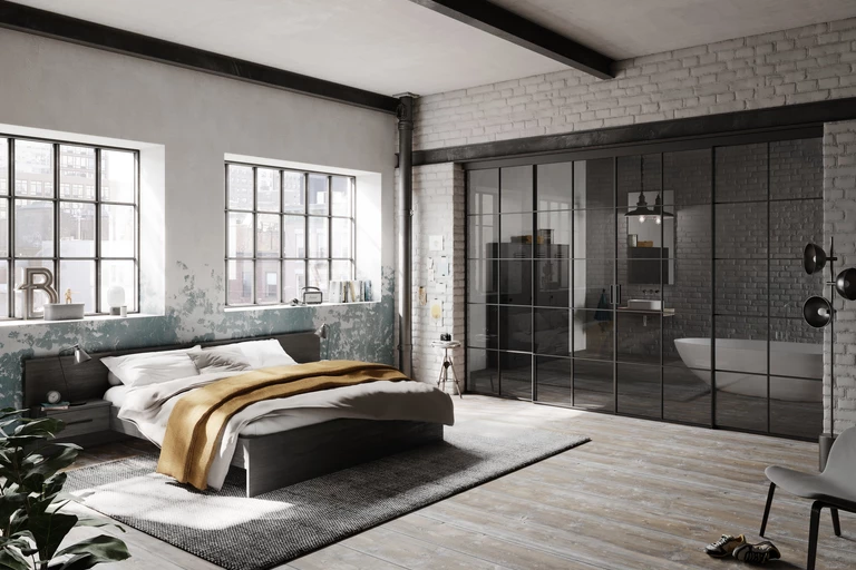 Styl loftowy cieszy się niesłabnącą popularnością! W odpowiedzi na ten trend, Raumplus wprowadził drzwi S1200Air w wersji z dekoracyjnymi szprosami. Ich układ jest ustalany każdorazowo indywidualnie i może przypominać fabryczne okna. Co ważne, drzwi S1200Air są pozbawione dolnego toru jezdnego, co pozwala zachować nowoczesny i elegancki efekt jednolitej podłogi. Warto również podkreślić, że wszystkie drzwi Raumplus mają uniwersalne zastosowanie, dlatego mogą służyć jako drzwi przejściowe lub do zamknięcia szafy.