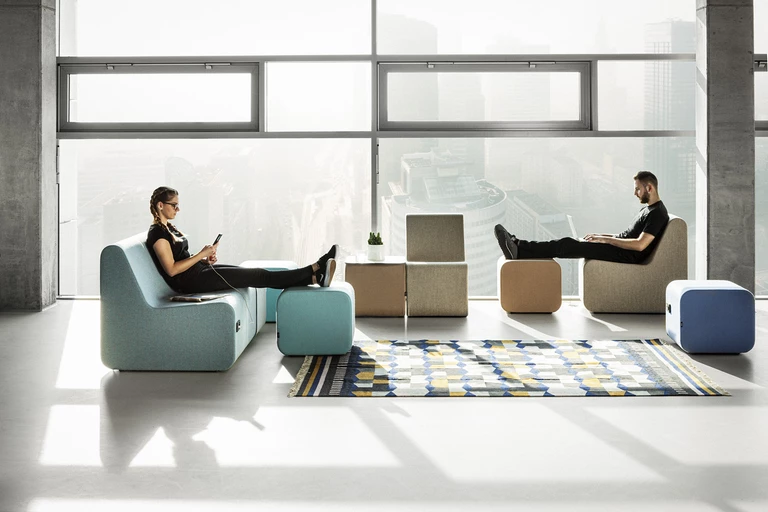W częściach wspólnych - strefach lounge i poczekalniach - wielkie trzyosobowe sofy bez przegród na czas zagrożenia wirusem powinny być wyłączone z użytkowania. Mogą zwolnić miejsce dla mebli jednoosobowych lub modułowych. Siedziska do oczekiwania, relaksu, pracy kreatywnej powinny być umieszczone w odległości co najmniej 2 metrów od siebie. Można stworzyć bariery dookoła foteli, stosować wyższe oparcia, ścianki wolnostojące, regały, wysokie rośliny. Warto wykorzystać funkcje modułowych sof z dodatkowym stolikiem przedzielającym siedziska. Na stoliku można postawić donicę z dużymi i gęstymi roślinami lub środki do dezynfekcji. Należy pamiętać, że ma to także znaczenie poznawcze i emocjonalne.