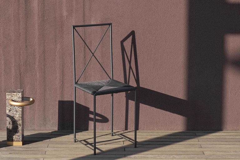 Oparcie ma elegancki wzór X, a siedzisko jest wykonane z tkanego włókna poliestrowego lub tkanej gumy poliuretanowej w ciekawej palecie kolorów od odcieni ziemi po bordowy i oliwkowy. Krzesło Moka Outdoor jest również dostępne w wersji wykonanej z litego drewna iroko, które może być wykończone naturalnie, polakierowane na biało lub pokryte szarą bejcą. W każdym z tych przypadków drewniana struktura opiera opiera się na metalowych stopkach i nylonowych podkładkach. Prostota tego mebla, jego lekki, niemal metafizyczny szkielet w zewnętrznym świetle prezentuje się doskonale.