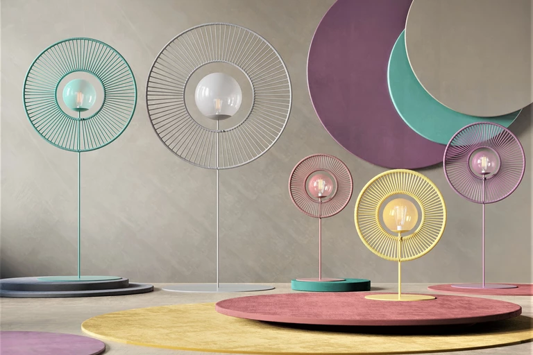 Lampy zbudowane są z metalu malowanego proszkowo, szkła barwionego w kolorach pastelowych oraz kolorowej żyłki syntetycznej zaplecionej na metalowych obręczach, w sposób charakterystyczny dla lat 60-tych, w których żyłki używano głownie do wyplatania foteli.