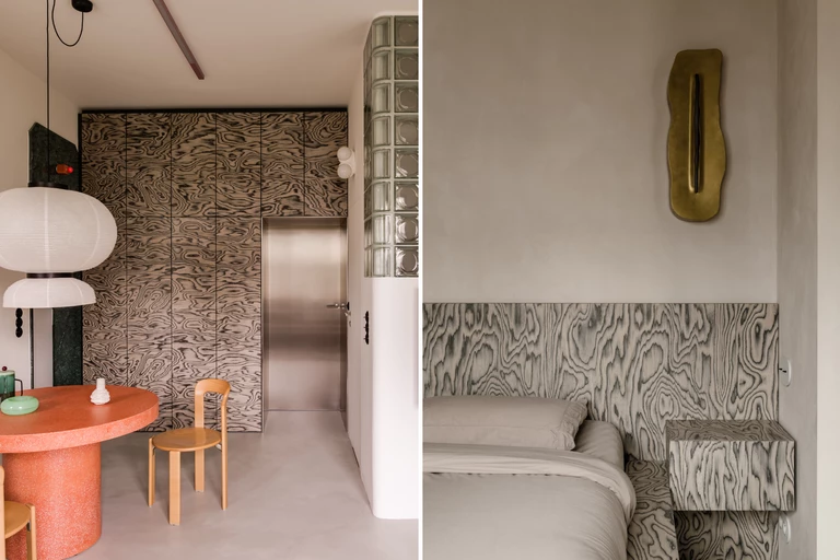 W projekcie wnętrza tego warszawskiego mieszkania auorstwa architekta Dawida Koniecznego motywem przewodnim są pustynia i fale. W tę stylistykę wpisuje się szary fornir ALPI, który pokrył bryłę łóżka. Jego wzór był inspiracją do stworzenia kinkietów z mosiądzu we współpracy z Ślusarstwem Friedrich.