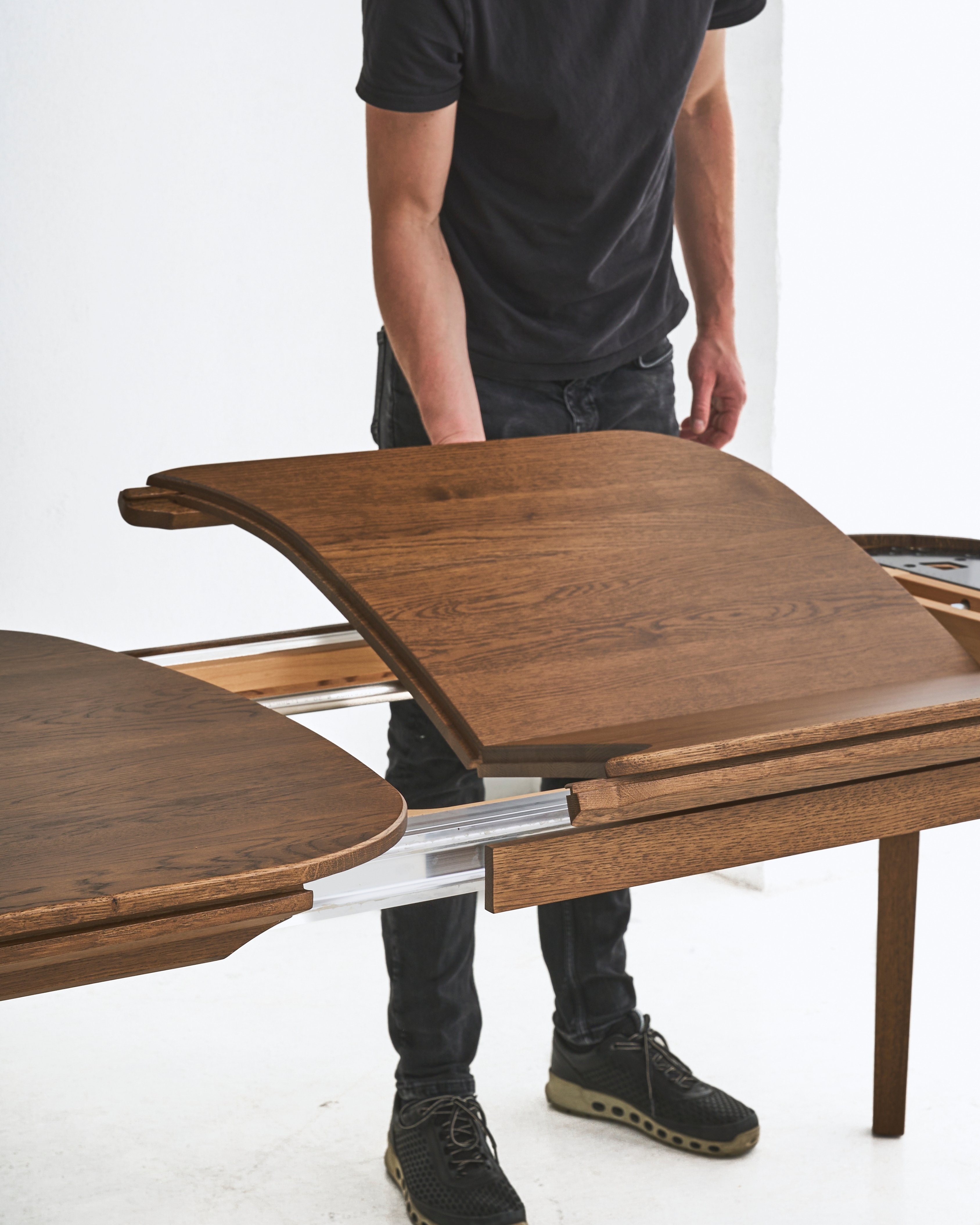 Drugim wyzwaniem była sama czynność rozkładania. Chcieliśmy, by przygotowanie miejsca dla gości było intuicyjne, płynne i możliwe do wykonania w pojedynkę – tłumaczą Smreki. Rozwiązaniem okazał się nowoczesny system motylkowy, który pozwala na rozsunięcie blatu i dołożenie dostawek jednym, gładkim ruchem.
