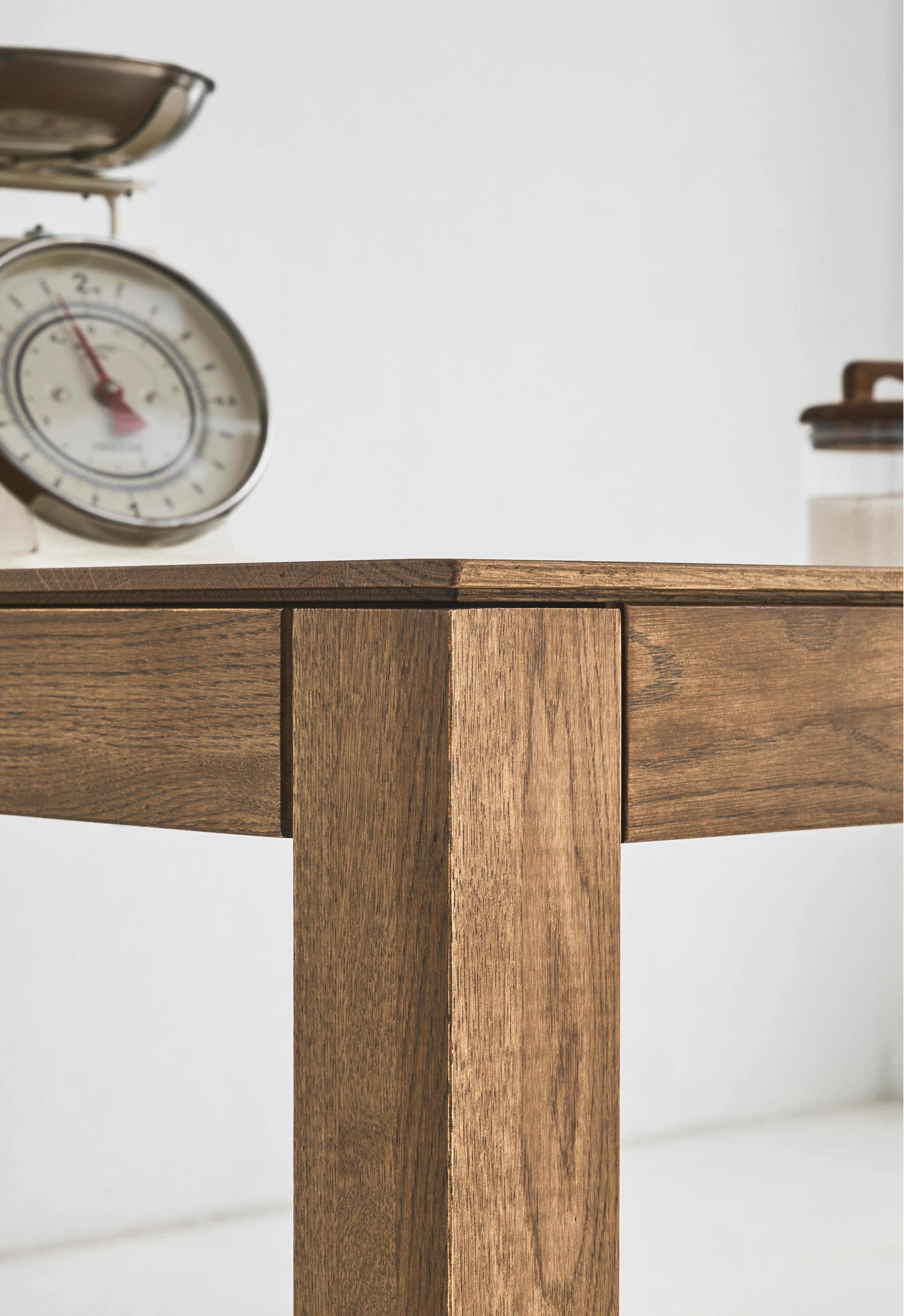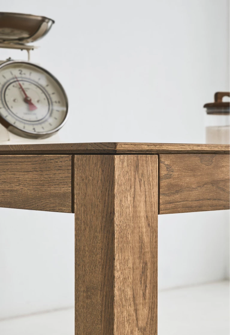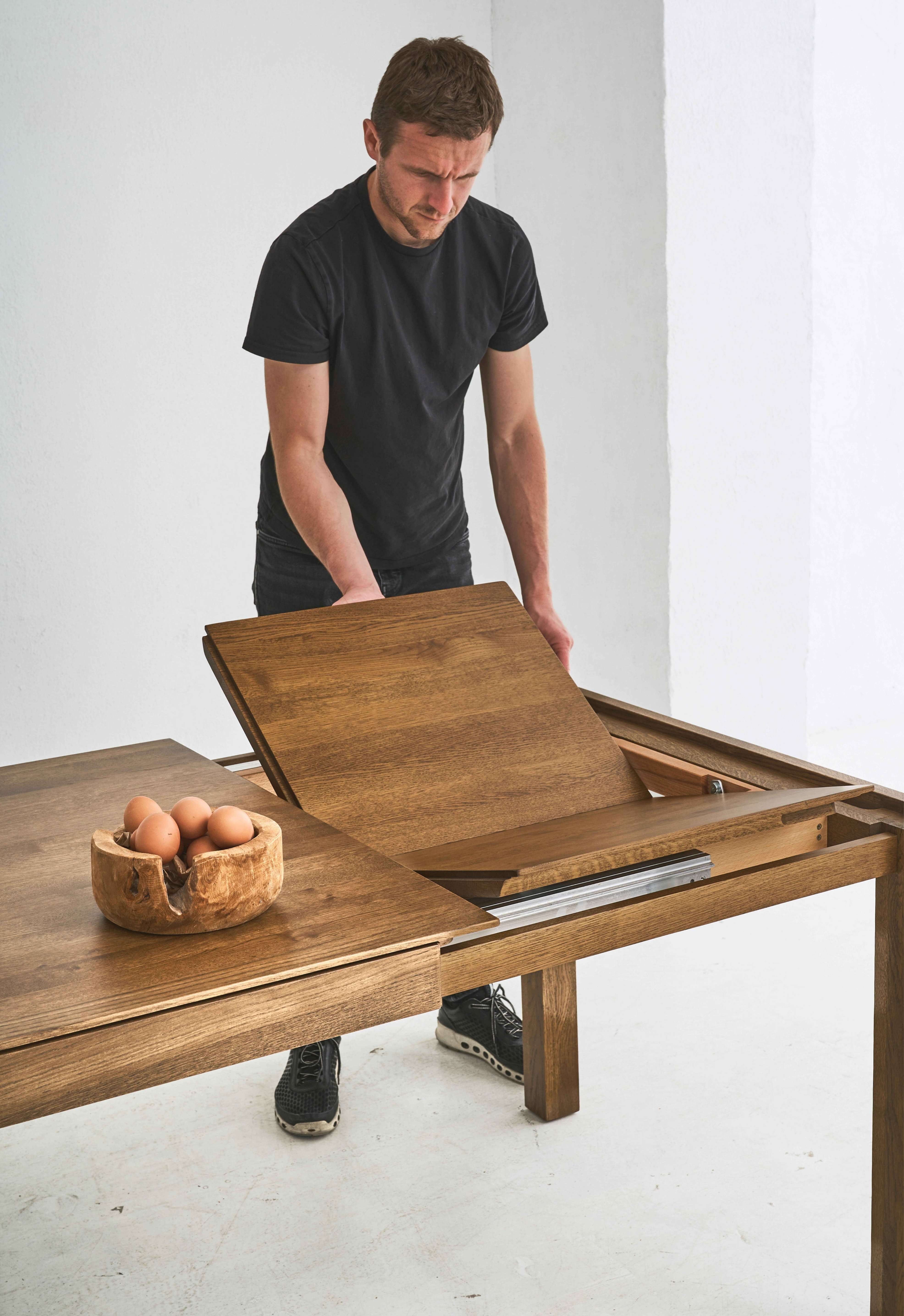 Punktem wyjścia w poszukiwaniach idealnego stołu rozsuwanego było jedno, kluczowe założenie: na co dzień musi on wyglądać jak pełna, elegancka bryła litego dębu. Chodziło o wyeliminowanie estetycznego kompromisu, jakim jest widoczne przecięcie blatu – problemu, który nie tylko zaburza rysunek drewna, ale jest też wysoce niepraktyczny.
