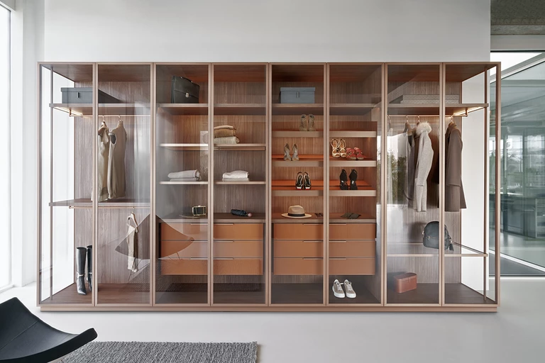 Luksusowy efekt całości zapewniają materiały oraz oświetlenie LED najnowszej generacji z ukrytymi, niewidocznymi źródłami, a zapewniającymi równomierną iluminację wnętrza. Ścianki garderoby pokryte są wysokiej jakości laminatem strukturalnym, który odwzorowuje najbardziej popularne gatunki drewna nie tylko pod kątem koloru i rysunku, ale również teksturalnym. W dotyku też nie różnią się od naturalnego materiału. Rama wykonana jest z aluminium – lekkiego, trwałego i odpornego metalu – i dostępna w szerokiej gamie kolorystycznej. Na przykład zgaszonej miedzi, która nadaje całości szlachetnego, matowego bliku. Elementy ozdobne, np. uchwyty szuflad wykonane są z miedzi.