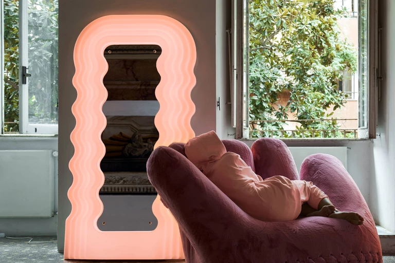 Lustro Ultrafragola (marki Poltronova) to podświetlane neonem lustrzane dzieło sztuki. Te faliste kształty są dziełem włoskiego projektanta Ettore’a Sottsassa, założyciela słynnej grupy Memphis.