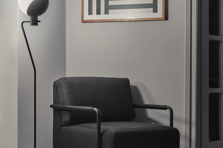 Charakterystyczną cechą kolekcji Muse jest prostopadłościenna poduszka podłokietnika skierowana, pod kątem, do wewnątrz siedziska.