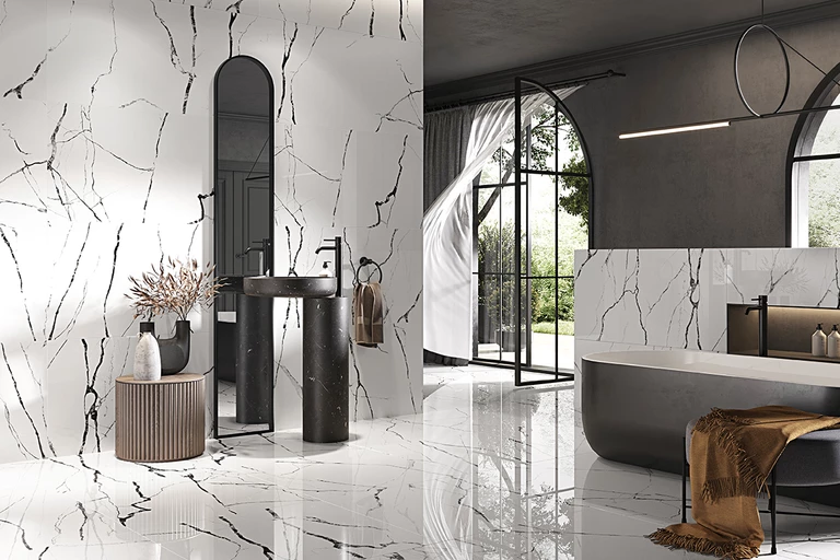 Tym samym surowy beton zyskał niezwykle elegancki sznyt. Kolekcja świetnie zaprezentuje się w salonie: na podłodze, ale również ścianie z kominkiem, czy reprezentacyjnej ścianie surowej recepcji. Elegancja, harmonia, relaks to skojarzenia jakie budzi kolekcja Distance o wzorze eleganckiego kamienia z delikatną fakturą. Kolekcja polecana jest do wnętrz o różnej stylistyce, a ze względu na swój stonowany charakter zwłaszcza do miejsc związanych z odpoczynkiem, jak salony kąpielowe. Wzór dedykowanej łazienkom kolekcji Eternal to mariaż dystyngowanej bieli i eleganckiej czerni. Czyste białe tło wzbogacone zostało czarnymi żyłami, co w połączeniu z polerowaną powierzchnią dało śmiały, designerski efekt. Płytki z tej kolekcji będą mocną bazą stylowych aranżacji.