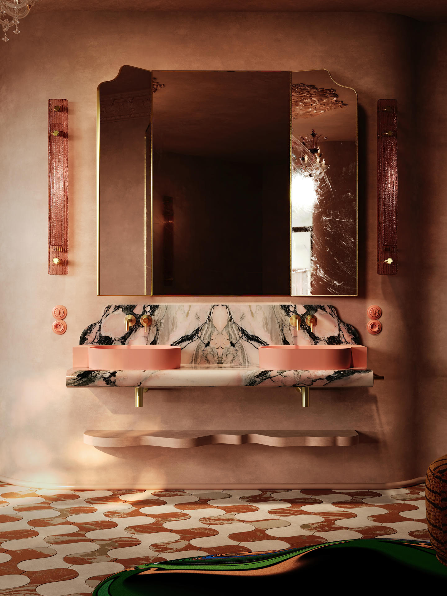 Efektowny żyrandol Murano symbolizuje wenecki kunszt szkła, postarzane lustra przywołują atmosferę paryskiego art déco, a bogata sztukateria prowadząca do strefy prysznica nawiązuje do ornamentyki Bliskiego Wschodu. Całość dopełniają szlachetne odcienie szczotkowanego mosiądzu obecne w armaturze OMNIRES Y oraz akcesoriach z kolekcji OMNIRES MODERN PROJECT i UNI, wprowadzające elegancki, współczesny akcent.