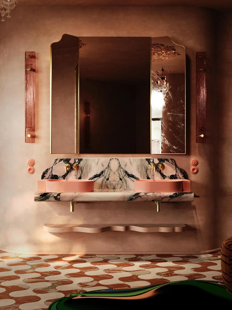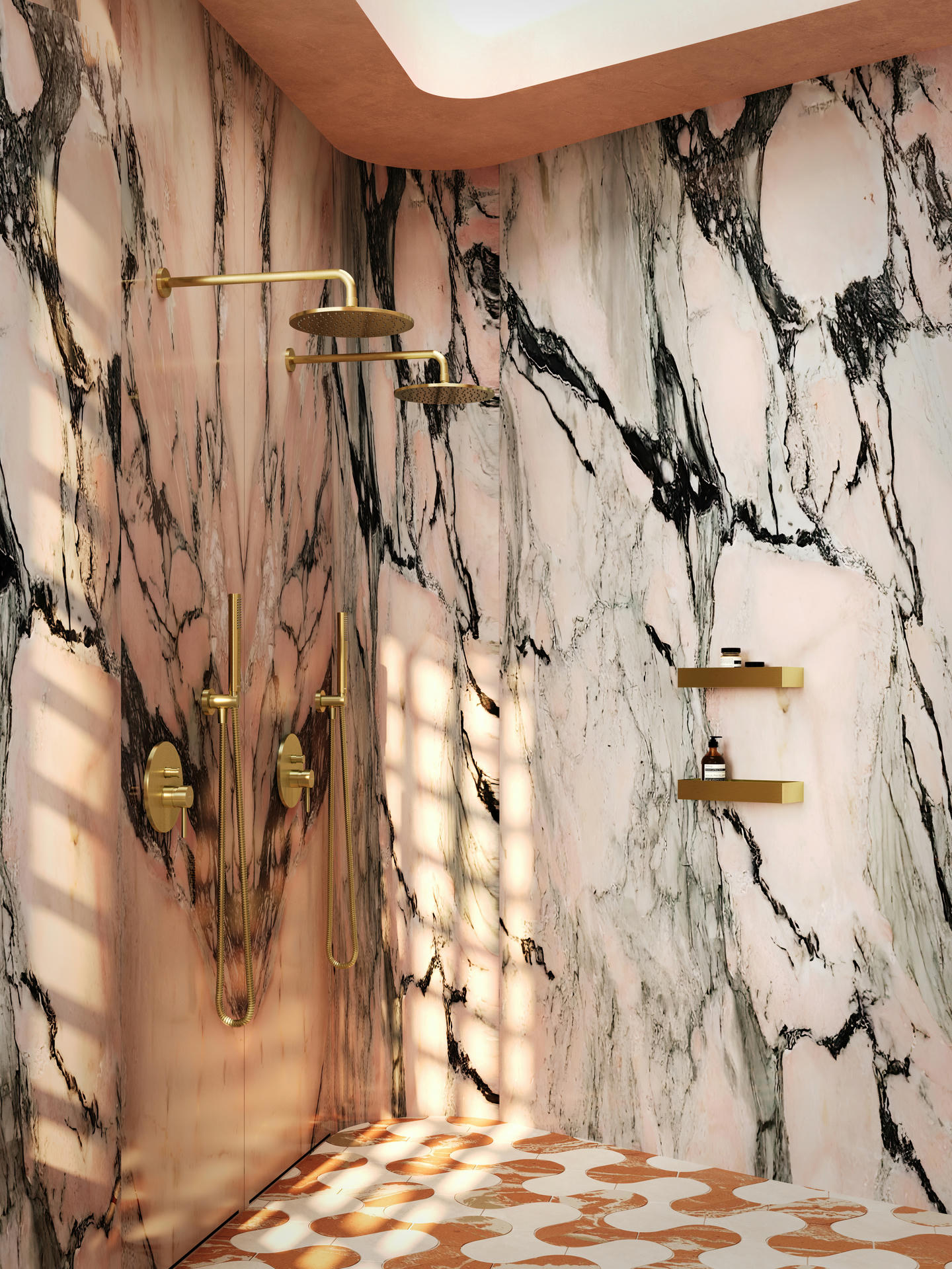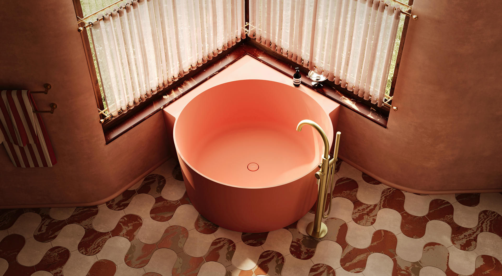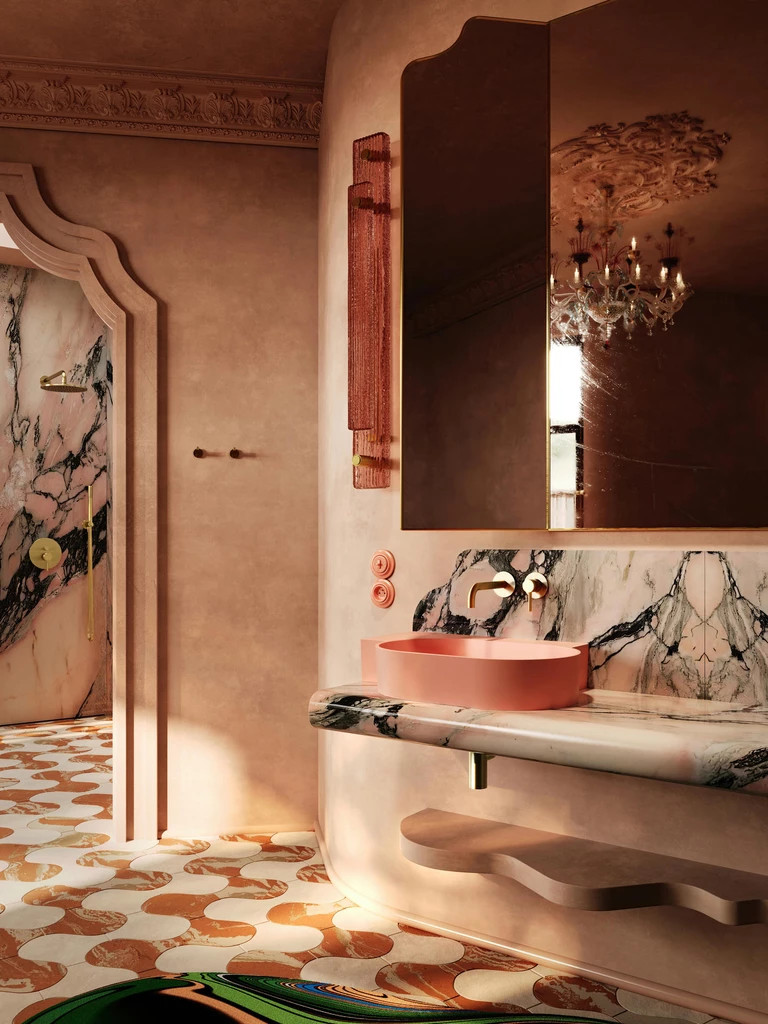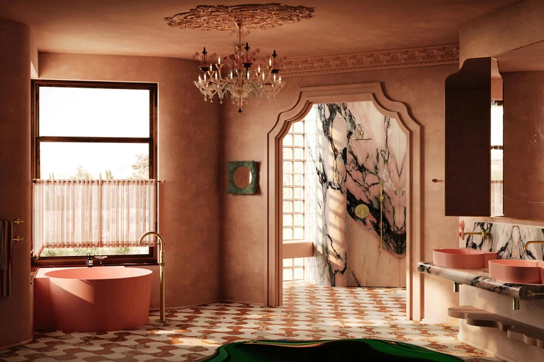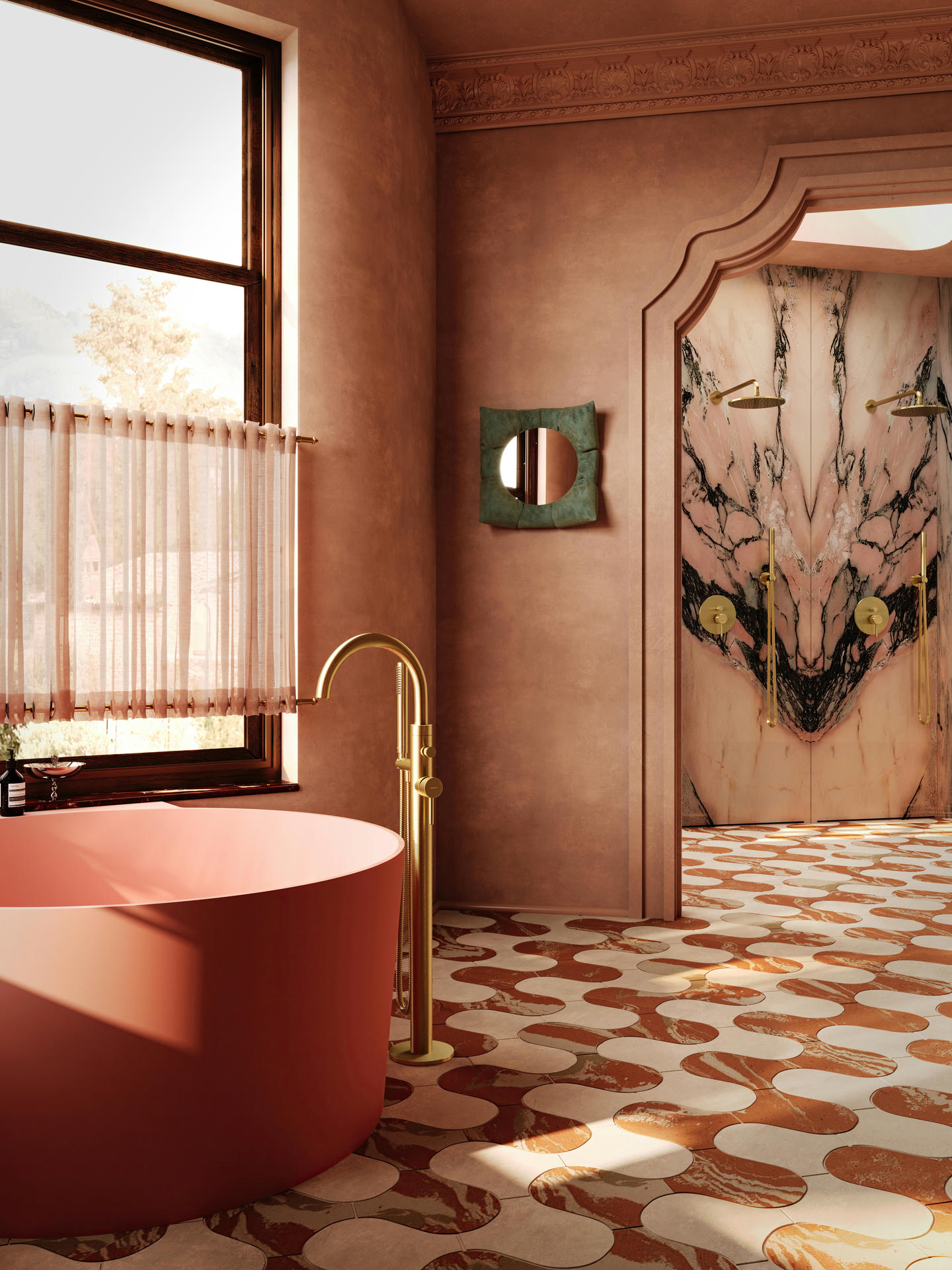 Spajającym motywem projektu jest odcień stonowanego różu i czerwieni – ciepły, nasycony oraz zakorzeniony w hiszpańskim pejzażu. Ukazuje się w muśniętych słońcem elewacjach, w fakturze starych murów i w szlachetnych marmurach – Rojo Alicante, którego głęboka czerwień z białym użyleniem snuje opowieść o południu Hiszpanii, oraz Calacatta Rose, w którym potężne, malarskie wzory rozlewają się niczym pociągnięcia pędzla. Ta paleta, spotykając się z kolorystyką wanny i umywalek OVO M+, stała się impulsem całej aranżacji.