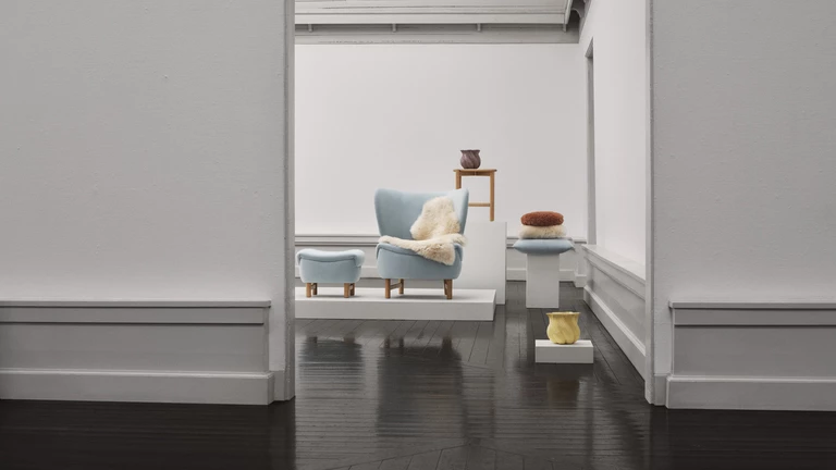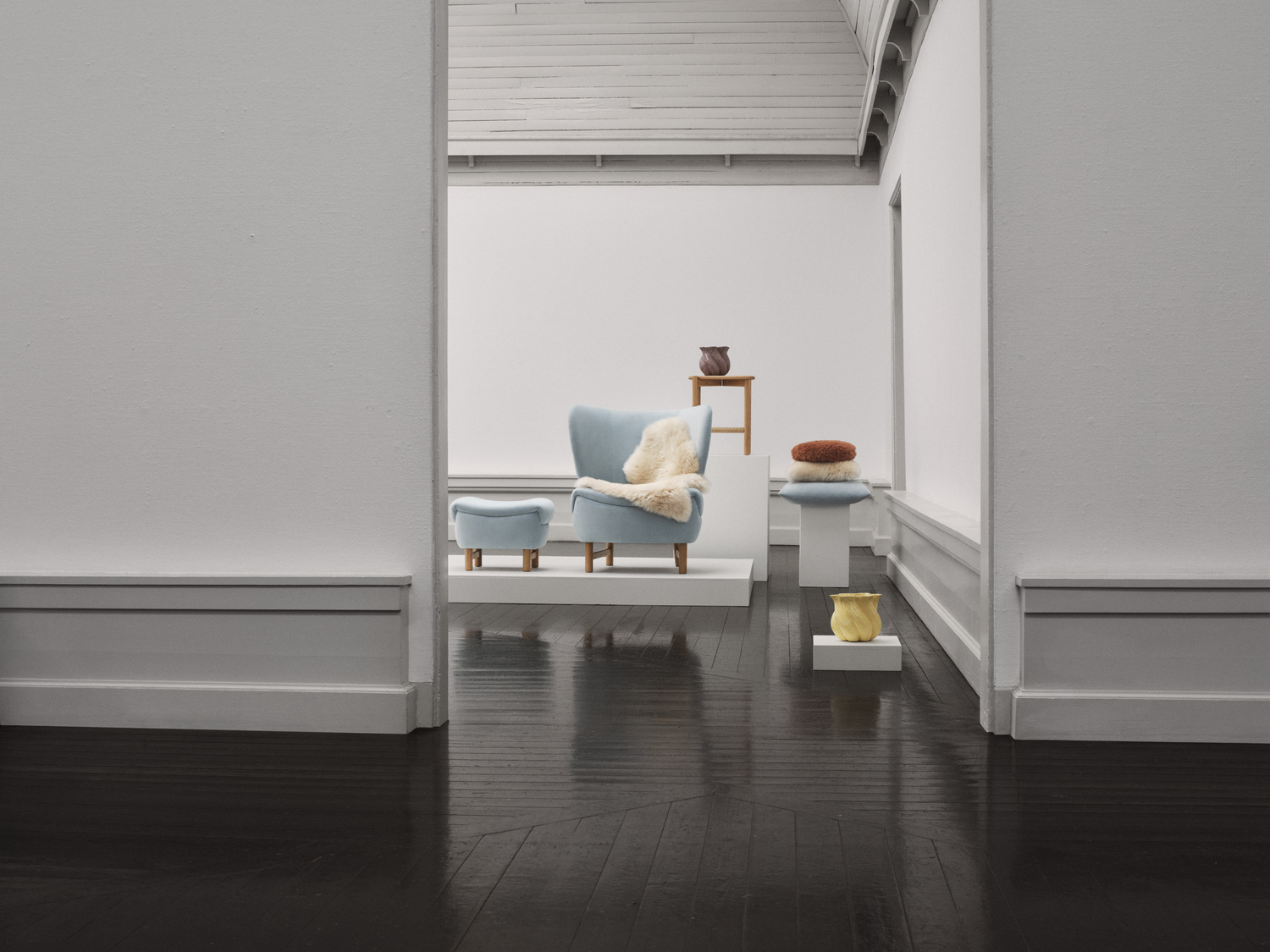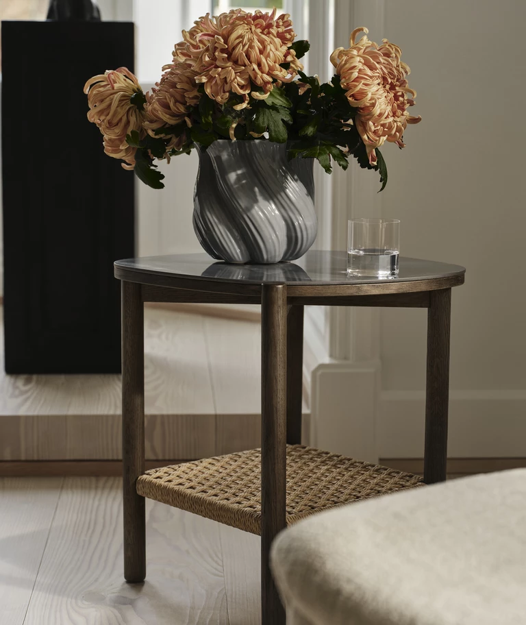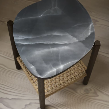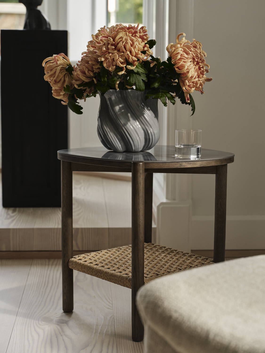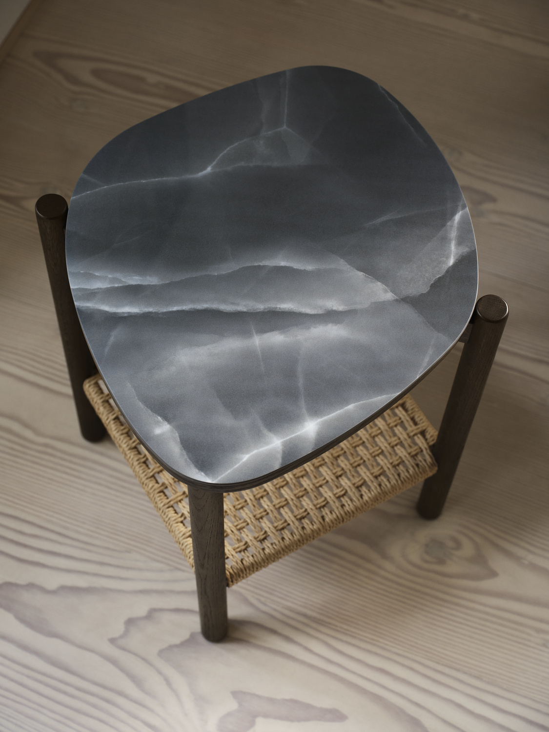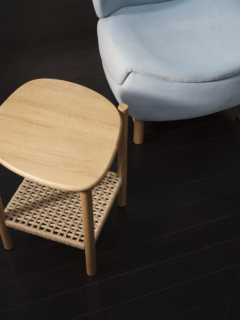 Głównym elementem kolekcji jest fotel wypoczynkowy o zamkniętej, organicznej linii. Projektanci postawili na miękkie wykończenia, które wizualnie i użytkowo mają kojarzyć się z poczuciem bezpieczeństwa. Towarzyszy mu stolik pomocniczy, będący zestawieniem różnych struktur: gładkiego, ceramicznego lub fornirowanego blatu oraz plecionej, rattanowej półki. Ten ostatni detal wprowadza do projektu rzemieślniczy, nieco bardziej surowy charakter, przełamujący nowoczesną formę mebla.
