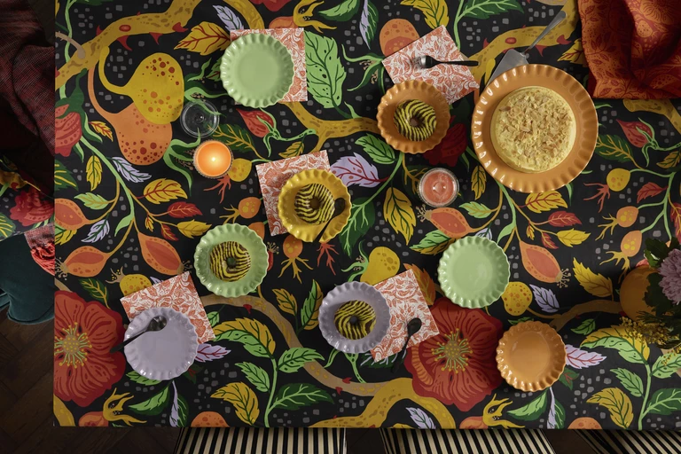 Jesienna kolekcja to przede wszystkim duża dawka koloru. Odnajdziemy go na obrusie  HÖSTAGILLE zdobionym ręcznie malowanym przez projektantkę Emme Prowse wzorem dzikiej róży, na paterach i talerzykach o falowanych brzegach czy pomarańczowym pledzie i poszewce na poduszce z kwiatowym wzorem. Nieco mroczniej prezentują się  kieliszki i szklanki HÖSTAGILLE, których szare szkło ozdobiło subtelne ryflowanie.